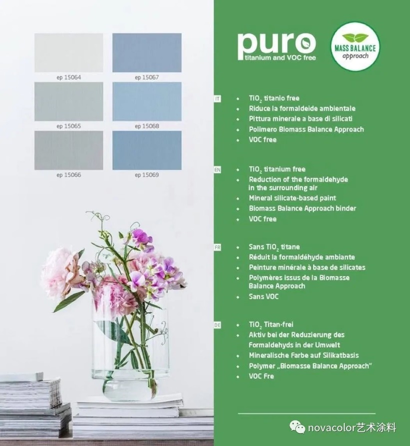 Puro菁純礦物墻面漆引入了「質量平衡」理念,結合全新技術,以健康環保、綠色建築為指導,是一種可持續發展的低碳生物質產品,是novacolor綠色方向的完美詮釋。它具有凈味、零VOC、零甲醛、零TiO₂、強遮蓋力、可減少二氧化碳的排放、強透氣性和強堿性、可顯著降低周圍環境中甲醛濃度等優點。