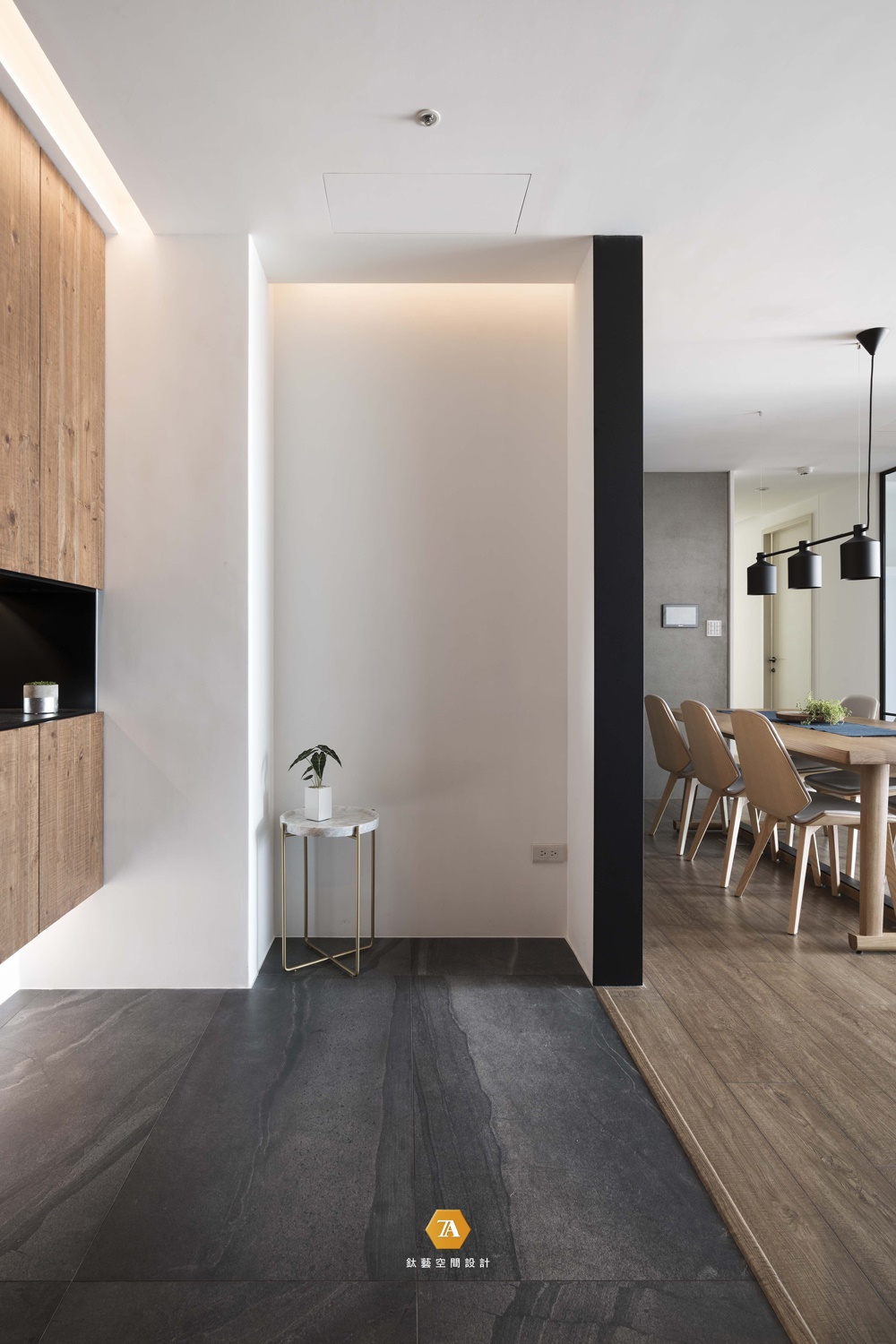 玄關以兩種不同顏色的地磚,將玄關與客廳進行了劃分,同時,黑色地磚又給人一種時尚感,而木飾面的吊掛鞋櫃與燈光搭配,又讓這時尚冰冷的地磚多了些許溫度。