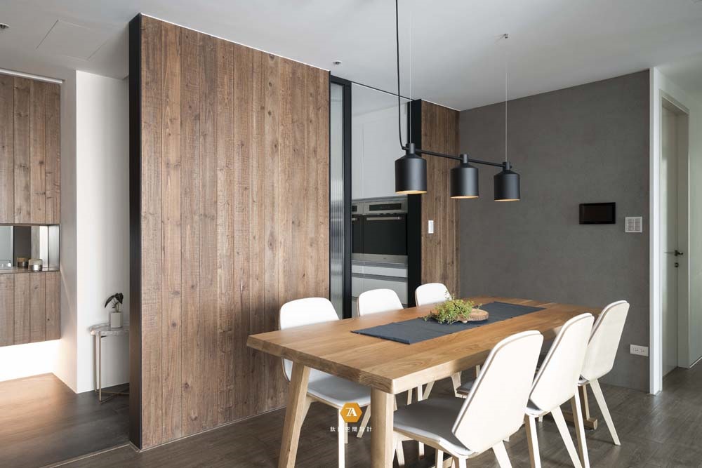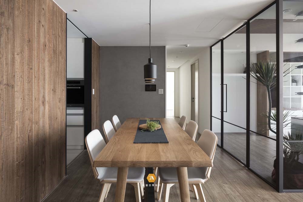 餐廳延續玄關客廳的溫潤氣氛,在餐桌的選擇上,同樣以木製餐桌來烘托氣氛;設計師通過將書房靠近走道的一面墻改為玻璃隔墻,使戶外采光能夠自然地深入家屋,並使眼界隨之延伸開闊,來讓原來相對受限的餐廳區域變得寬敞明亮。
