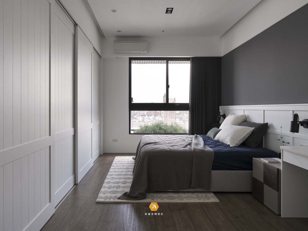考量業主喜愛旅遊的性格,設計師決定采用簡單的設計手法,將臥房打造為洗滌風塵的靜謐所在,選用低彩度色系搭配大塊面的白,佐以美式風味的線板表現;主墻處鮮明的色彩對比及框格線條,將墻面、床板、床頭櫃及方鏡串連一體,更證明了簡單也能富有趣味;而充足的儲物空間,則讓場域於穩定色度中完備日常所需,進一步將簡潔雅致的空間收束於實用可親的機能之中。