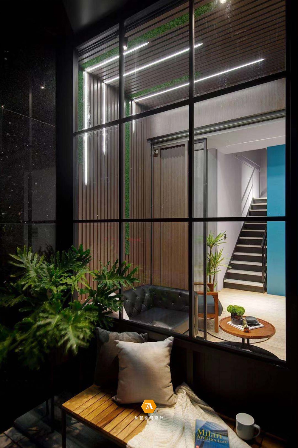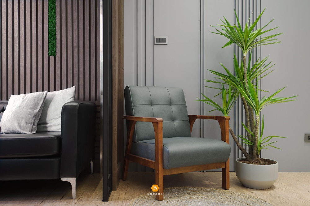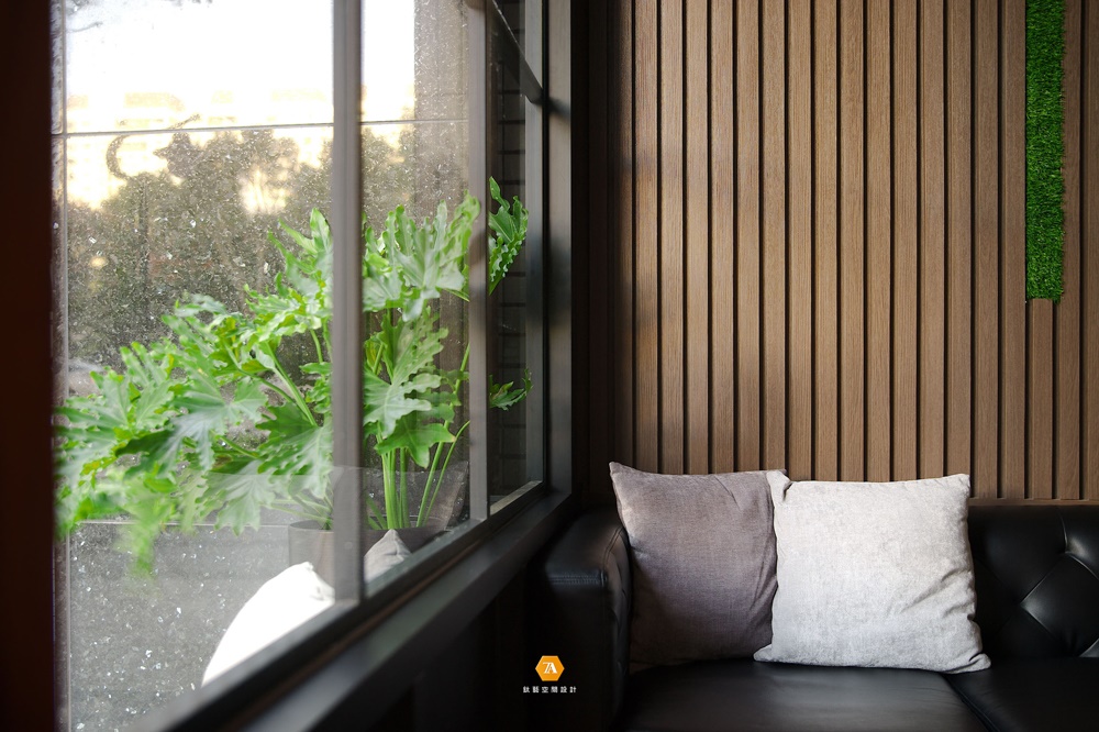 步入內部空間,待客區背景墻以日式禪風格柵為主體,並將其延伸至天花板,搭配線性燈光和不規整仿真草皮做修飾,創意滿滿;窗外的景色透過大面英式格子窗,投射進來,為在此等候的客人們營造出寧靜舒適、身心舒暢的感官氛圍。