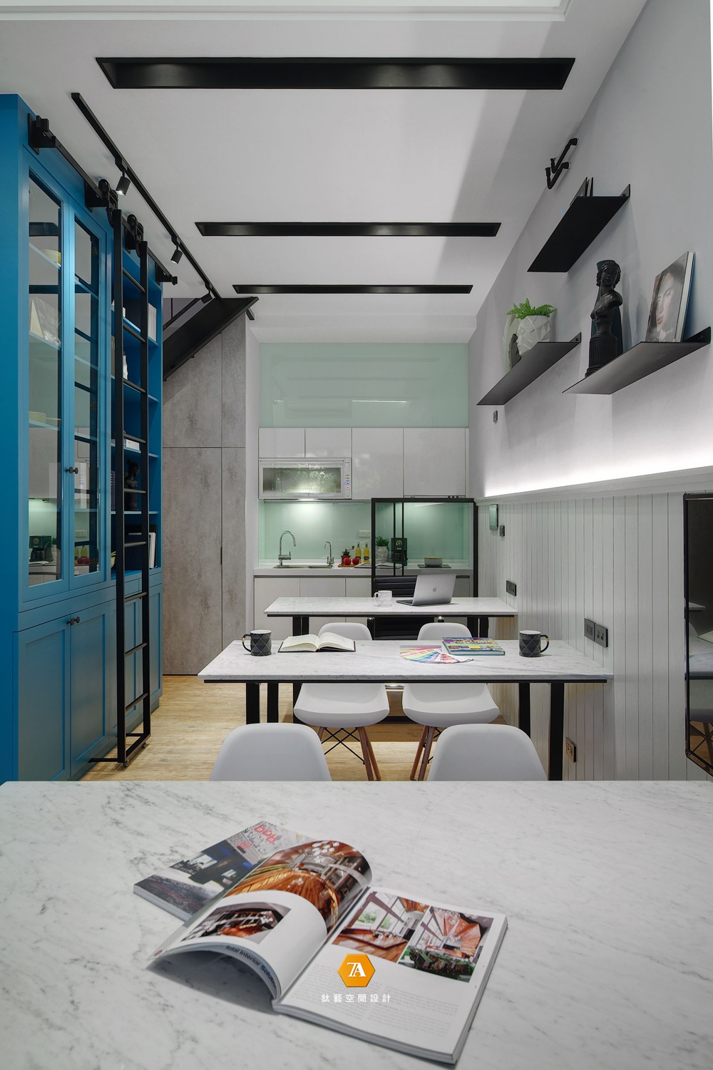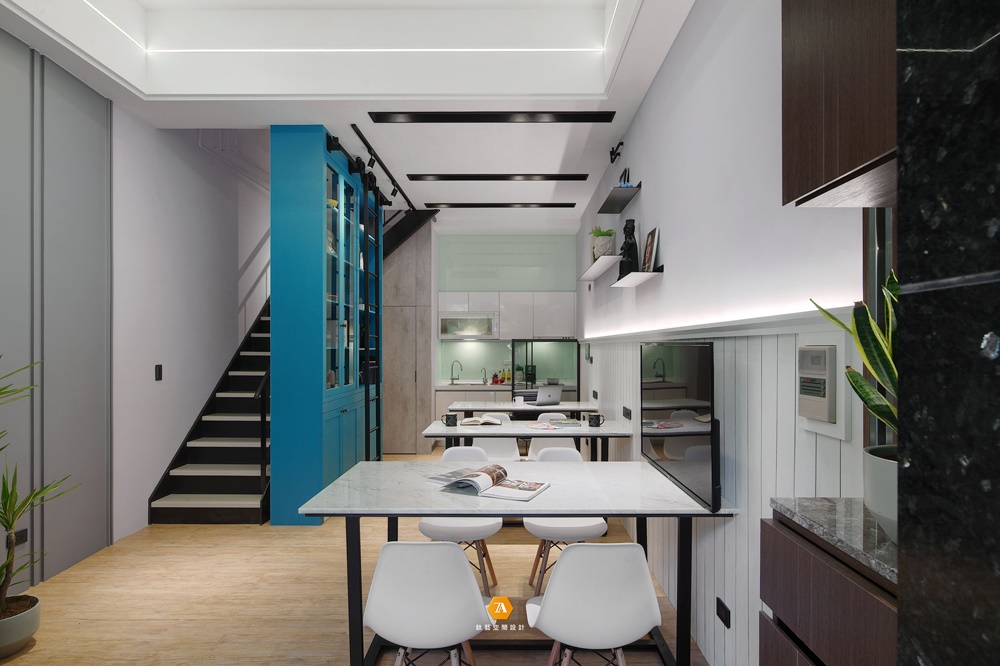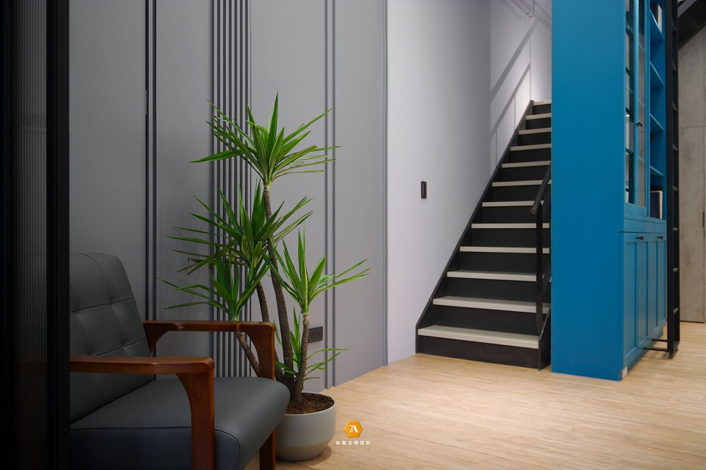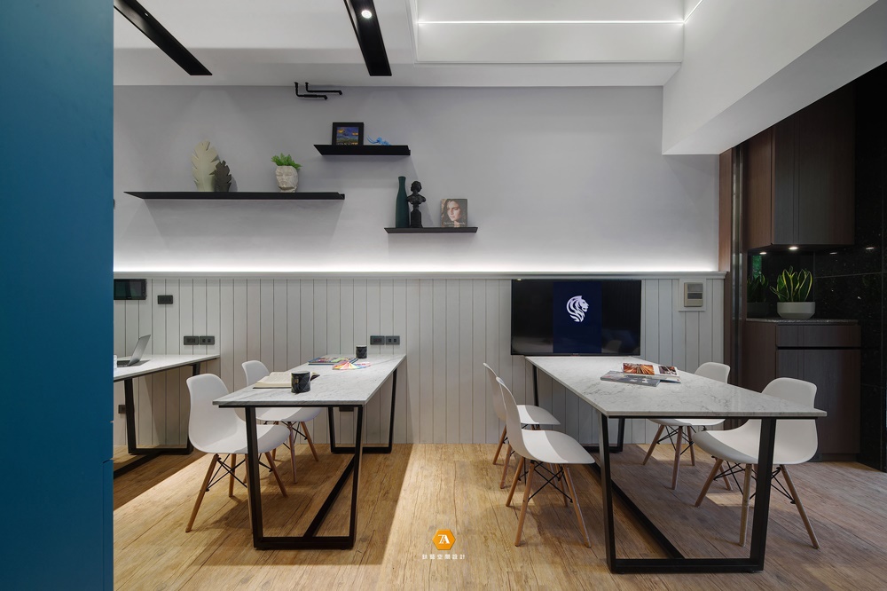 進門看到的另一空間便是辦公區域,紳士藍的烤漆高櫃映入眼簾,突出空間的優雅氣質;輕工業風格的鐵件層板與天花光帶營造出空間的層次感,而簡約的辦公桌椅,與小巧的水吧臺則使在此辦公的人們,感受到如同家一般清新舒爽,溫暖人心的感覺。