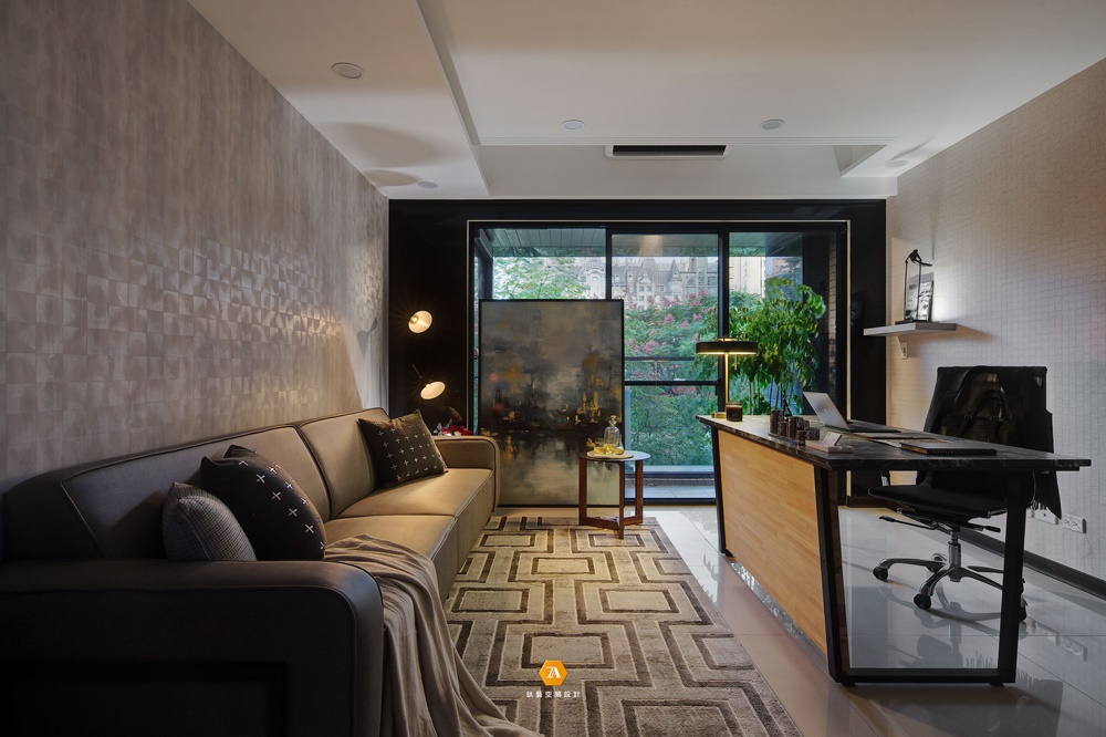 行至二樓,來到主管辦公室。與一樓寬敞明亮、舒適爽朗的空間風格不同,設計師以灰暗色調為中心,將深沈莊重發散至整個空間,為客戶營造出了一個可供人靜心沈思的辦公空間。渾厚的皮質沙發與大理石的主管辦公桌,則體現主人待人處事的豪情大氣和對生活的高雅追求。