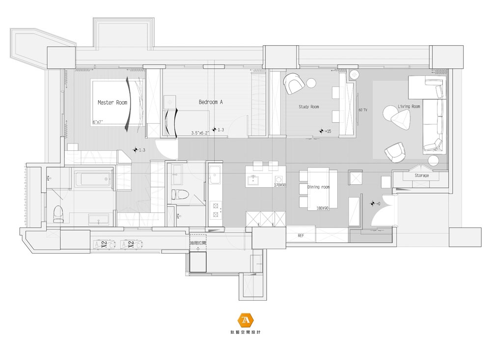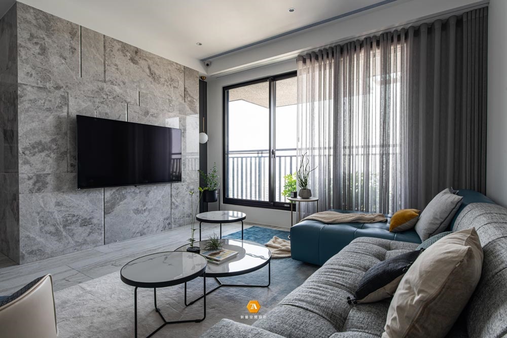 置身白凈色域的客廳,運用簡潔而方正的線條架構空間,並鋪設灰質磁磚地板呼應大理石電視墻、灰漆飾帶,以及灰藍相間的齊頂壁櫃,打點出溫和的中性色調。而開放幅度幾近滿墻的大片窗扇,則適度地為場域剪裁日光,並在紗簾和清透無觸下,使之均勻地鋪撒入室,映照軟件由內向灰白漸變為外向的藍綠色彩,恰好迎合窗扇鋪墊的日光暖座,並與栽種露臺的綠意光景融出一片自然氛圍。