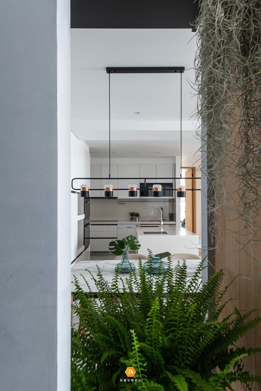 玄關采取穿透設計,輕巧隔間與清透的收納吊櫃所構成的視覺夾層,恰好露出筆直安排的餐食區域,搭配置於前景的盆景及垂吊植栽,使生活如畫,深刻入微。