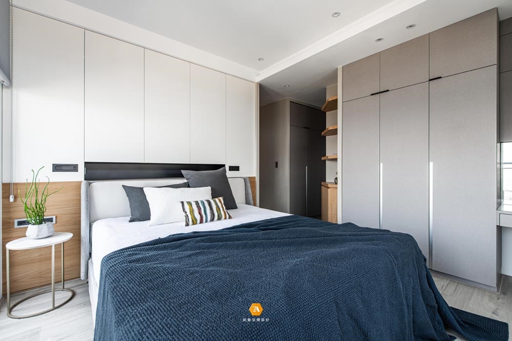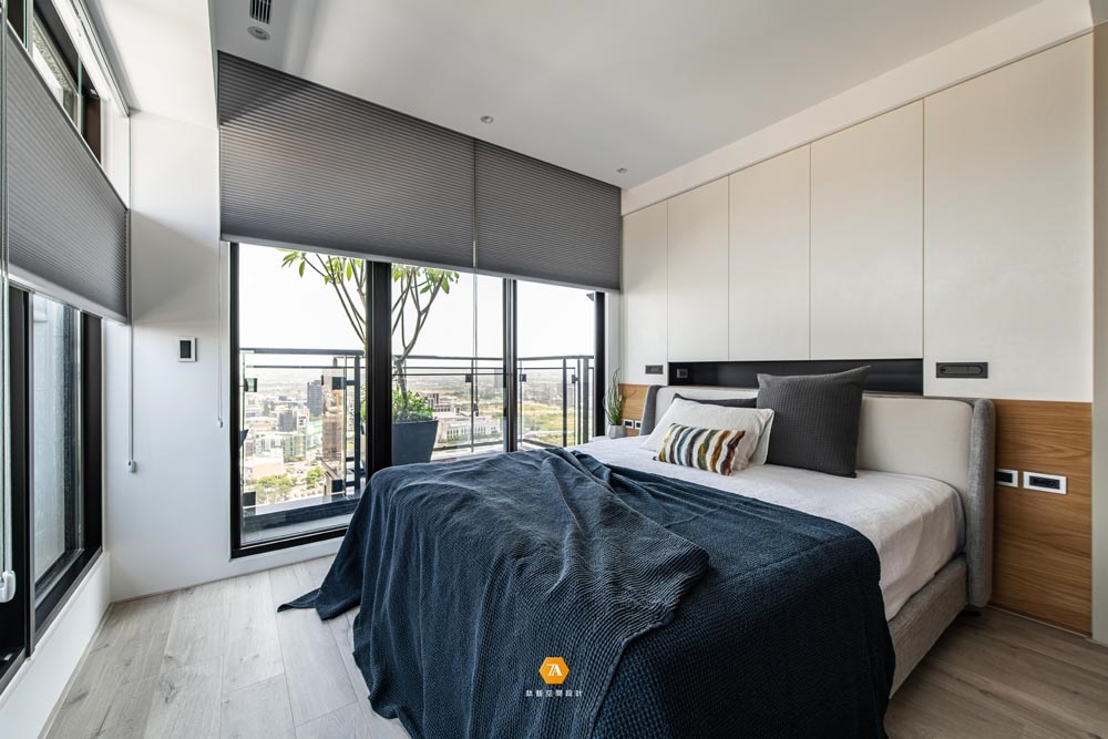 走向廊道底端,迎面而來的斜角層架將空間走勢指向臥床,其圓潤的床頭繃布與親昵肌膚的棉麻質感,溫婉地牽引身軀輸入場域核心。主臥采用輕柔的拼木地板,朝天伸展出隱身灰白色階的鑲嵌壁櫃,期間鏤空部分填入黑調及銀白鍍鈦,一則精巧地增添立面層次,另一則化身質樸場景的閃耀之處,與床頭的金屬圓幾穩穩相應,讓雙面窗扇全心投入的晴雨盛情,喚醒簡單而美好的日常。