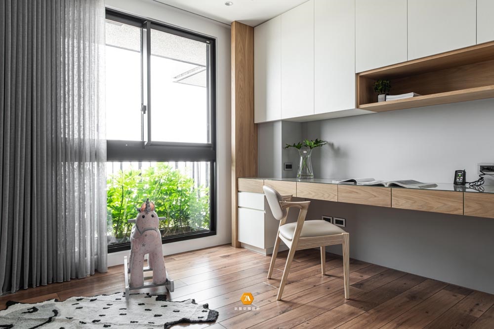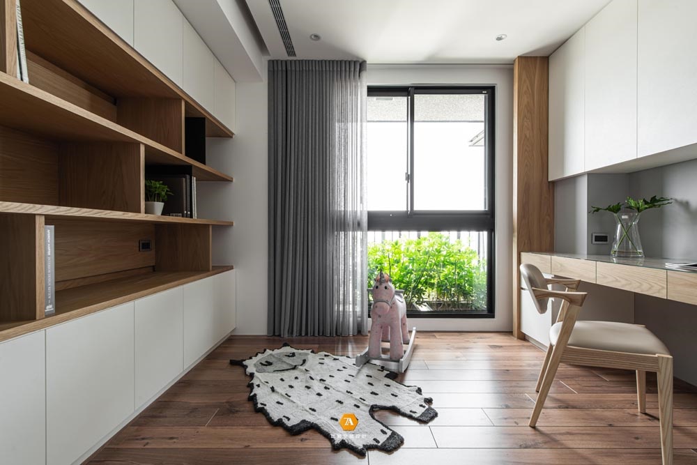 開啟書房,設計者簡單放入的光、木頭與靜謐氣息了然眼前;因應落地款式的窗,應和清波門片的鐵件巧思,回歸樸質可愛的幾何分割,並在趣味效果之外、將大自然的明媚與嫩綠一路傳遞至室內側餐廚區,順耳帶動滿室簡約的線條與色彩。屹立左右的收納櫃體則由沈穩的木質擔當,或開放或封閉地使展品及藏書各安其所,圍塑一方天光盈照的穩密天地,同時成為包容親子互動的寬敞園地。
