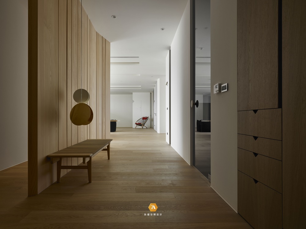 木質格柵靜悄悄開啟過道處序列,流動的分割動線,讓區域間若有似無,增添隱私感,也為白墻立面繪染動人表情,在兩者之間構築出玄關唯美的風景,為生活挹註不多不少的溫度。