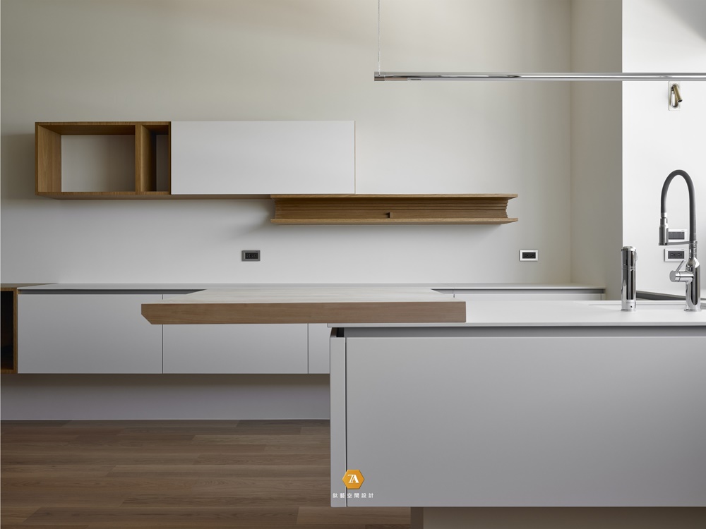 廚房延續簡潔明了氛圍,給使用者輕盈自在的愉悅感受;挑高天花,與天窗的運用,將室外光線引向一墻之隔的客廳室內,創造潔凈明亮,寬敞舒適的空間體驗。