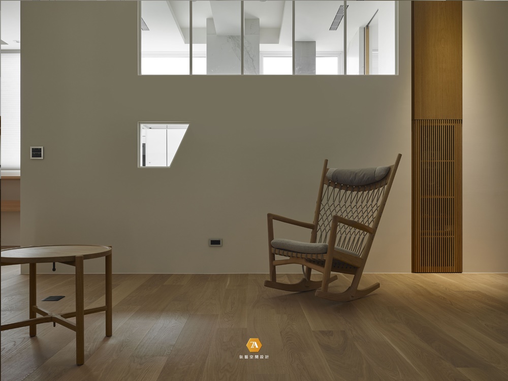 起居空間僅以線構搭建變化,保留大量地休憩機能,不作過多地裝飾,讓一桌一椅成為唯一主角,且穩實而置的於光線遊移,緩述著微妙光影變化,凝靜的對話充斥於空間。