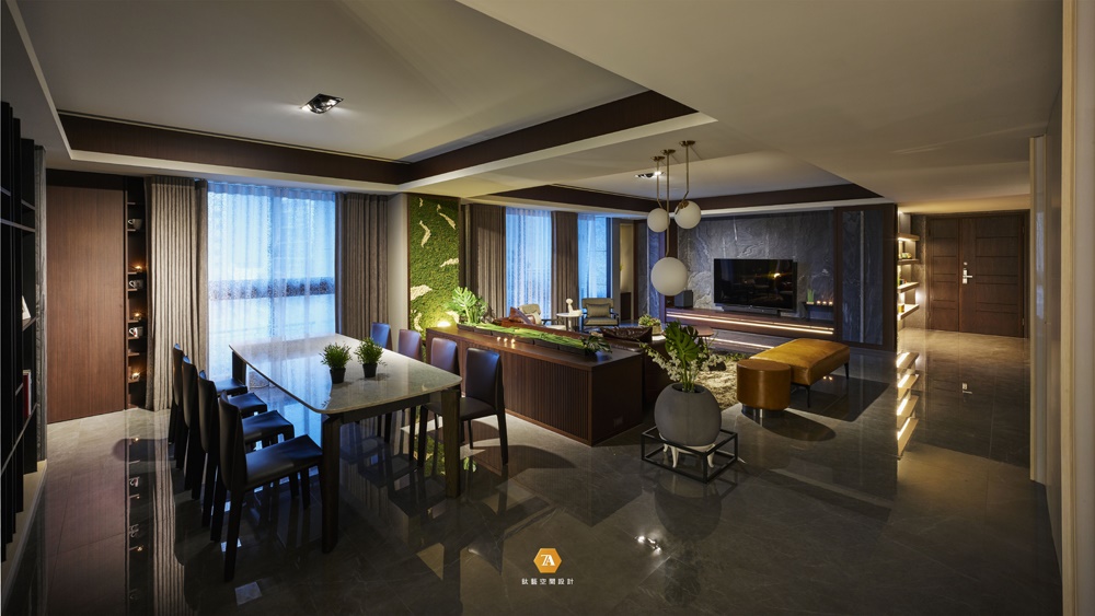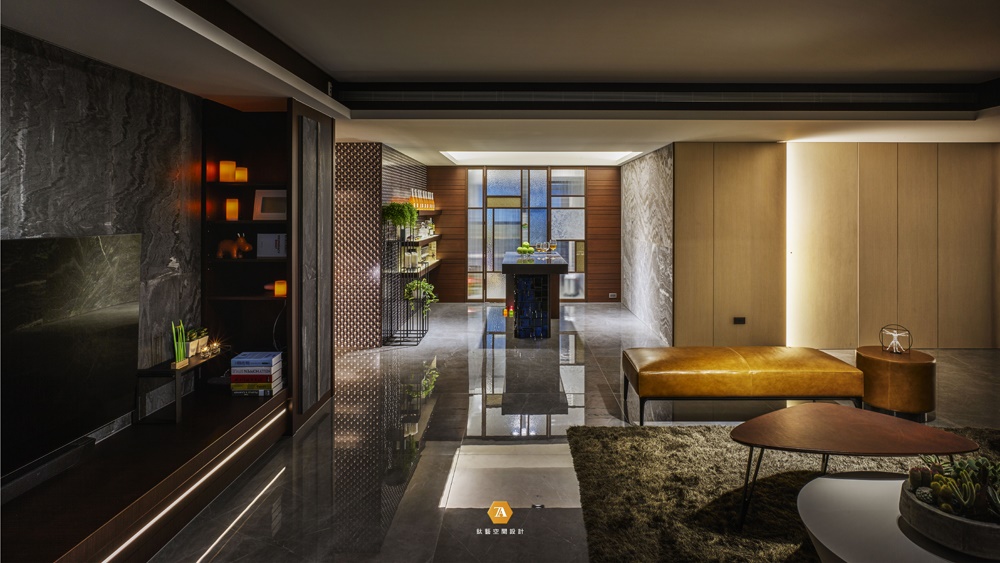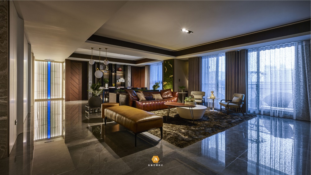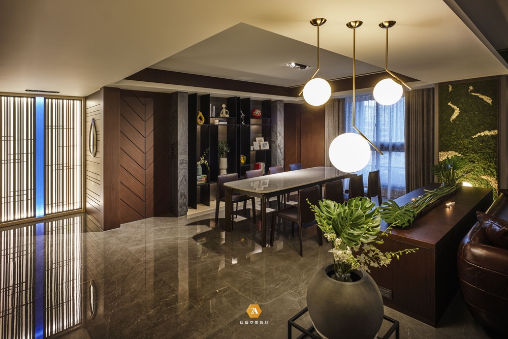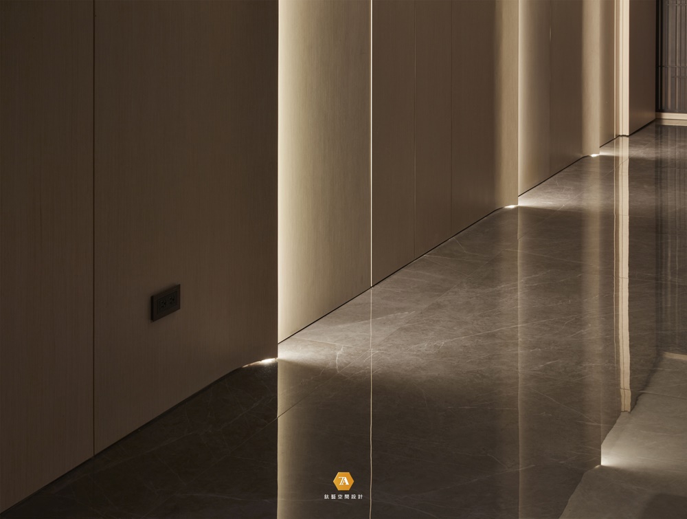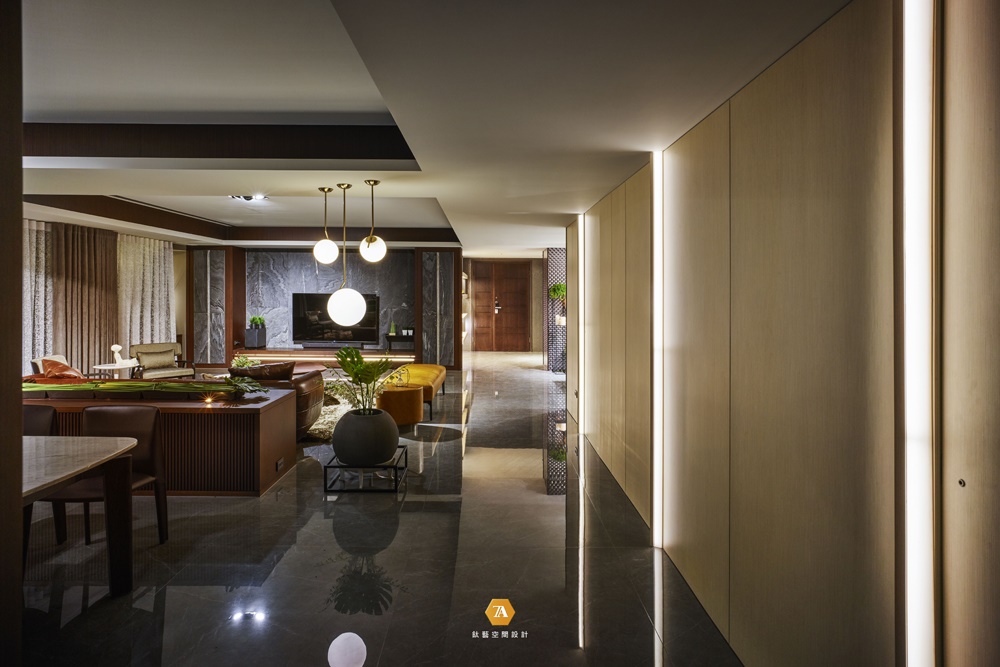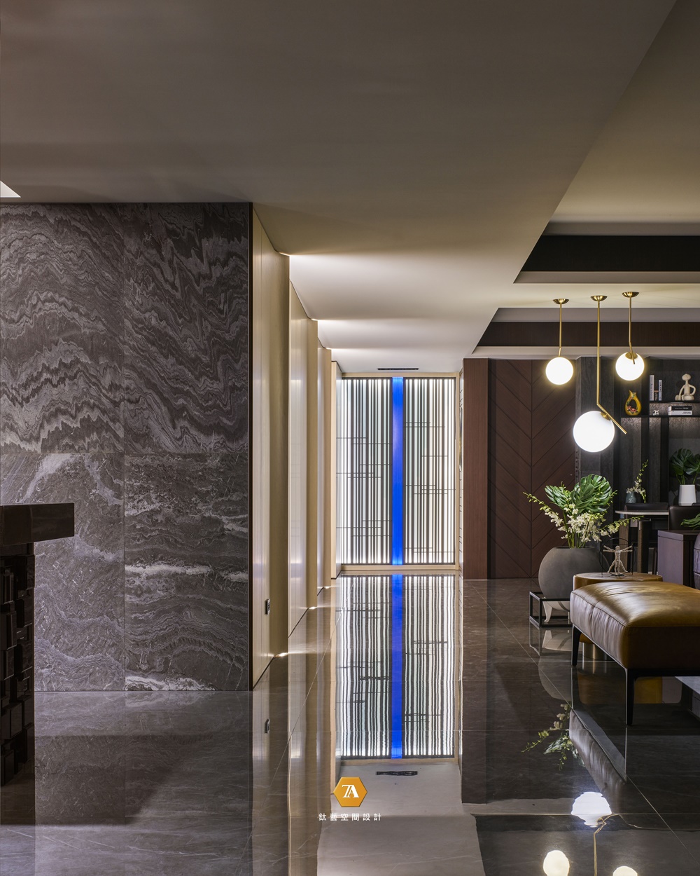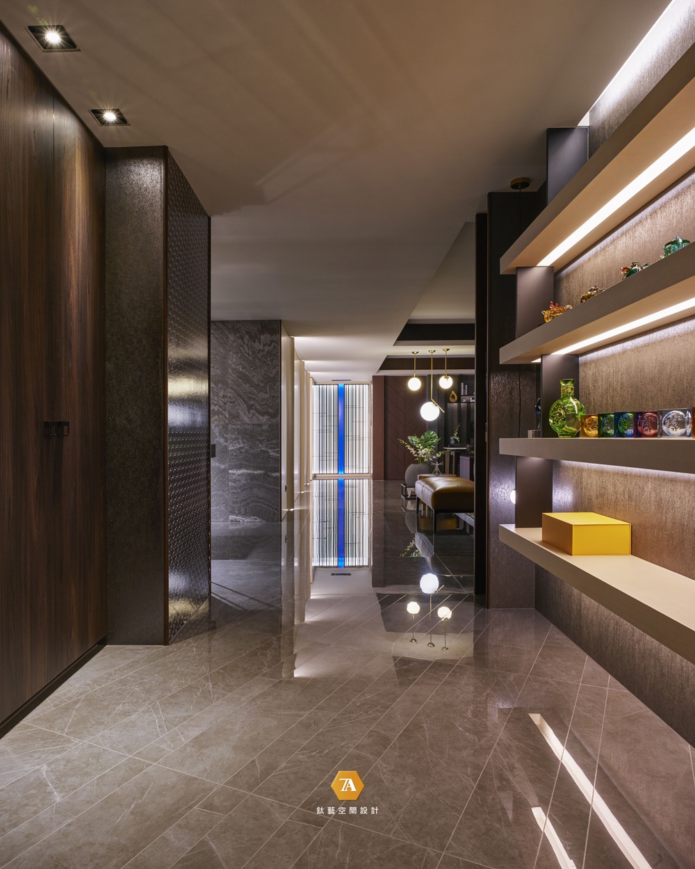 開放式玄關拉伸室內景深,廊道墻內嵌入照明燈的弧形設計,形塑空間的層次變化。而端景處特別定製鐵件藝術品,在藍光與白光照射中映出精致時尚格調;透過大理石地面倒影延展,在虛與實間交錯成有趣的對話。同時,水滴型鑲金色邊的鏡子點綴深色木面,與鐵件共築奢華又不失沈穩的風格。