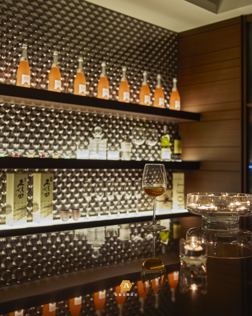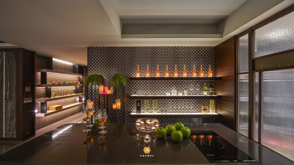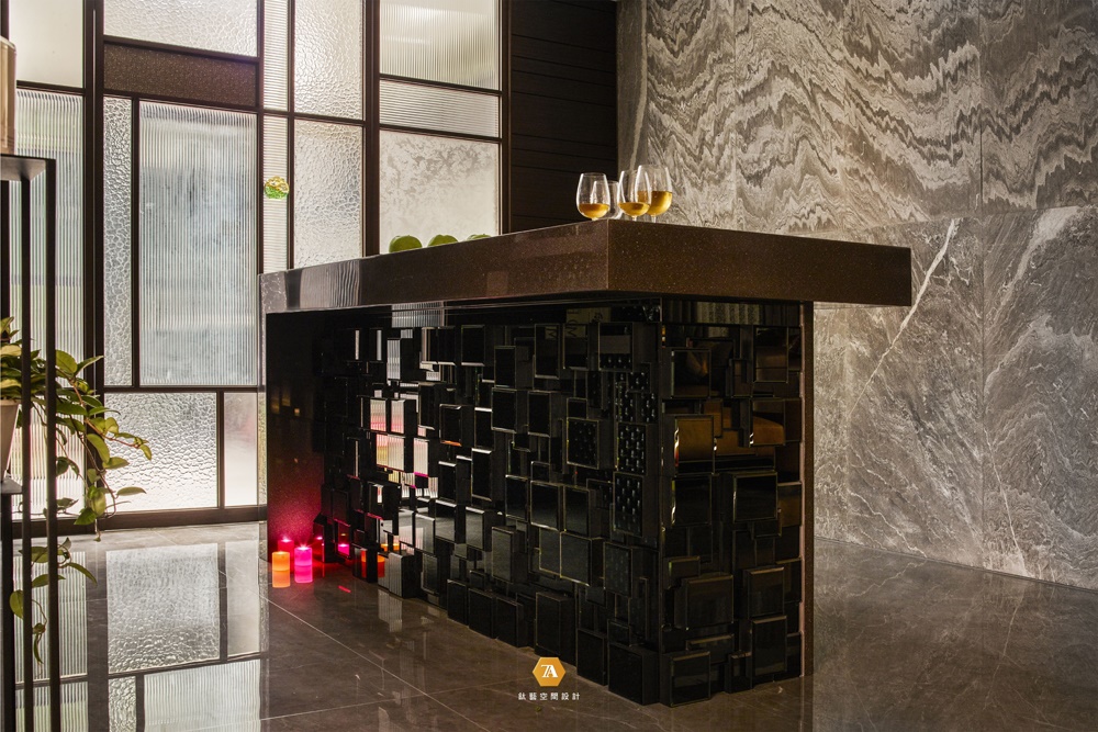 客廳一隅,金屬壁紙映襯著精品酒架,在底部精心安排的燈光,透過架子上酒瓶、玻璃杯的投射,讓空間中感受到濃濃的酒吧景象;同時,仿蠟燭的燈體閃爍稀微光芒,為環境點上高雅的情調。中間矗立的吧臺采用蒙德裏安的幾何元素,使用立體分割,與拉門上的幾何圖案相呼應,在黑亮的臺體上展現時尚前衛的設計風格。山水石壁的沈穩之下,為家庭打造閑適優雅的飲酌角落。