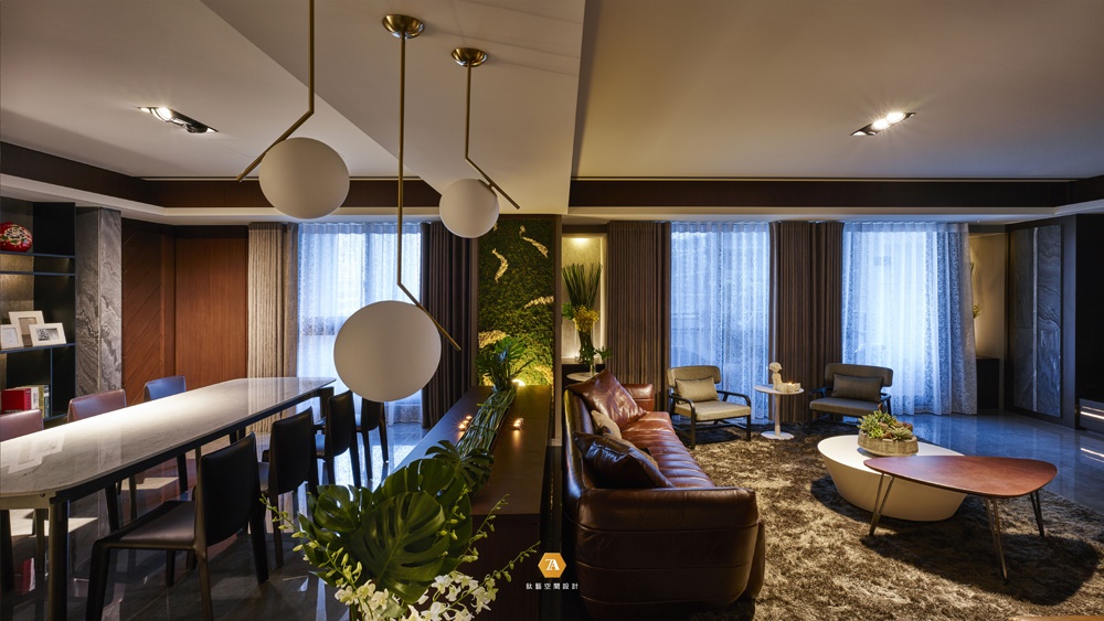 綠色植生在櫃體周圍攀爬依附,共同劃分場域形塑半開放式空間,簡約時尚球體的造型燈飾,也在客廳閃耀,隱約間隔兩邊領域,更為家註入了意思暖意。空間布局上,設計師特別將餐廳移往客廳與主臥之間,讓餐廳不僅是用餐時使用,更多時候能與家人聯絡感情,不論是靜靜的喝茶看書,亦或是共同桌遊談心,家的情感流動都在其中得到詮釋。