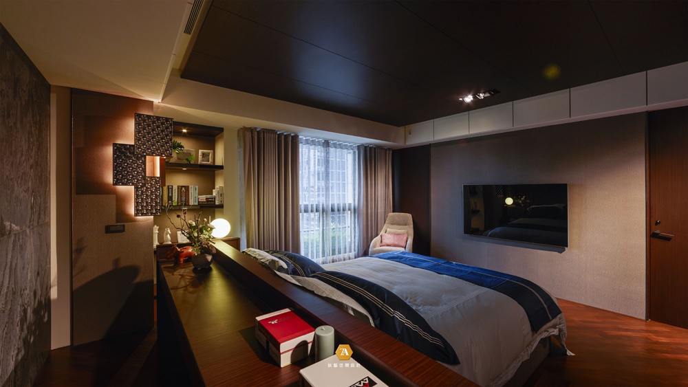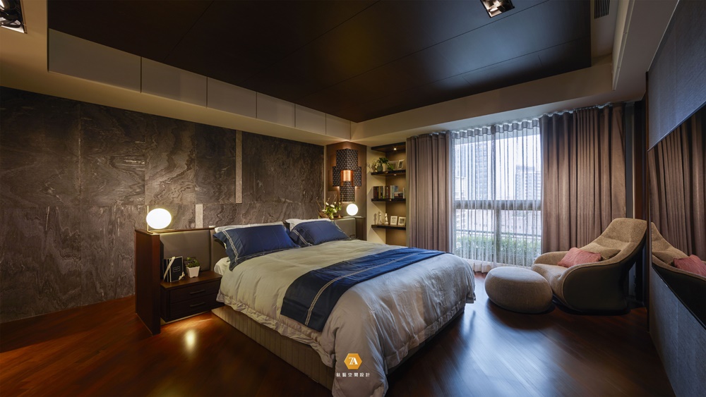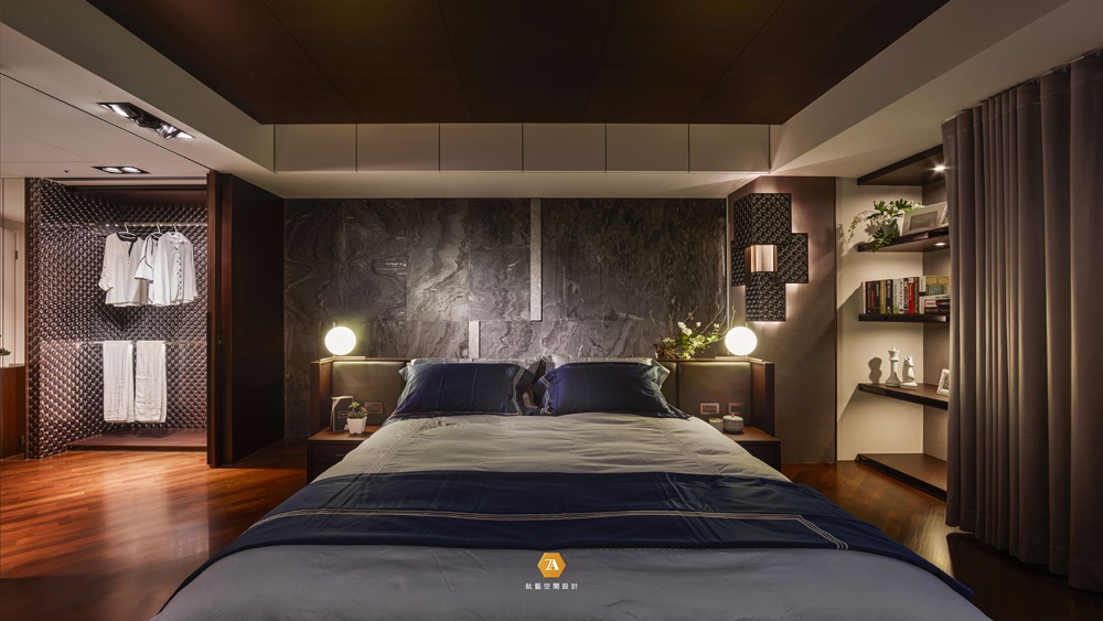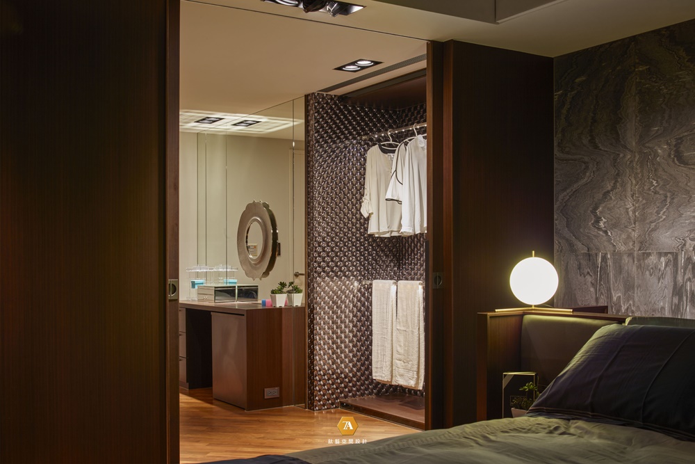 主臥將極具東方色彩的山水石與西方奢華風格壁紙融合,透過木皮溫潤的質調,串聯起整個空間,打造沈穩大氣不失雍容的臥室,特殊的床頭櫃設計,與球型燈體共築簡約質感。衣帽間以拉門作為間隔,金屬質感的壁紙及大片鏡面,無形中達到擴展視覺的效果,在格狀壁紙華麗的語匯襯托下,為主人收藏那份從容優雅姿態。