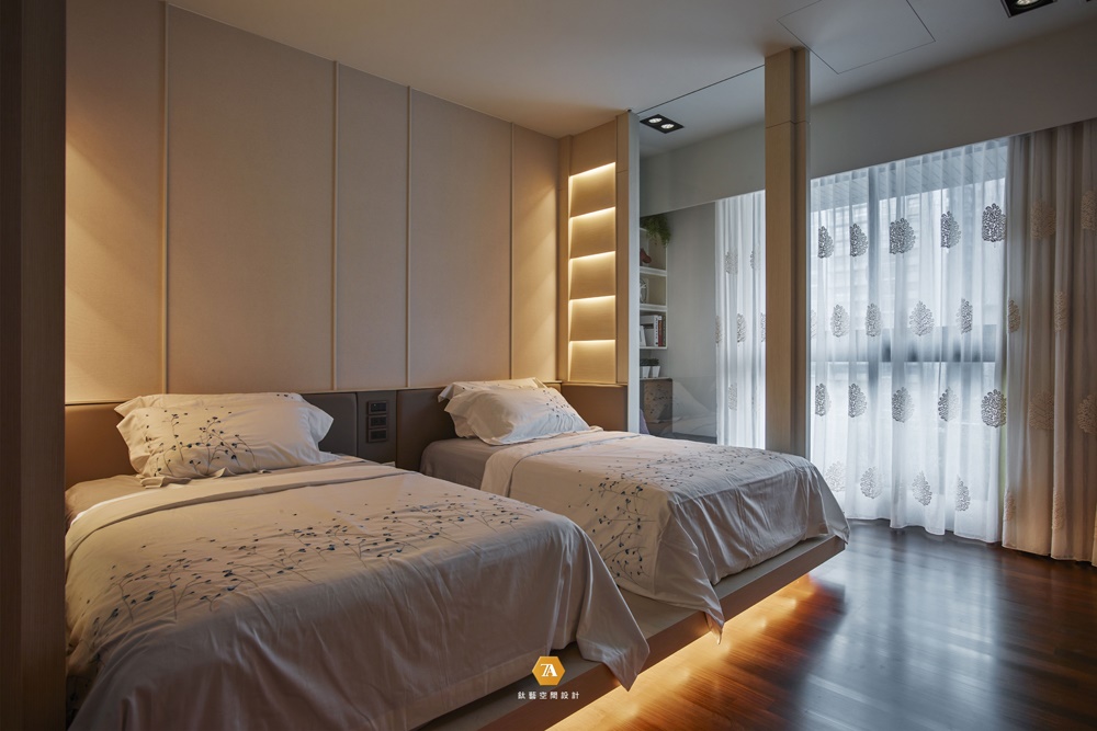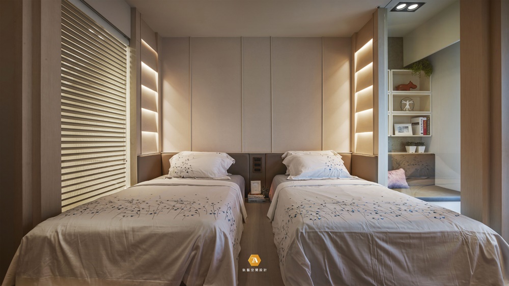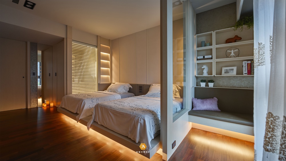 客臥房以純白展開,各個角落大量采用嵌入式燈光,讓溫暖的橘燈照耀黑夜裏的冰冷,床腳邊的光線更能感受到設計師的貼心,環繞著守望的意涵,為漆黑中點亮路線,為住客領航回到被窩的懷抱。采光良好的窗戶旁,建構另一片秘密天地,坐上小沙發,品嘗窗外美好風光,與自己的沈思對話,亦說是看著小說沈浸於幻想中,都是悠活雅致的好處所。
