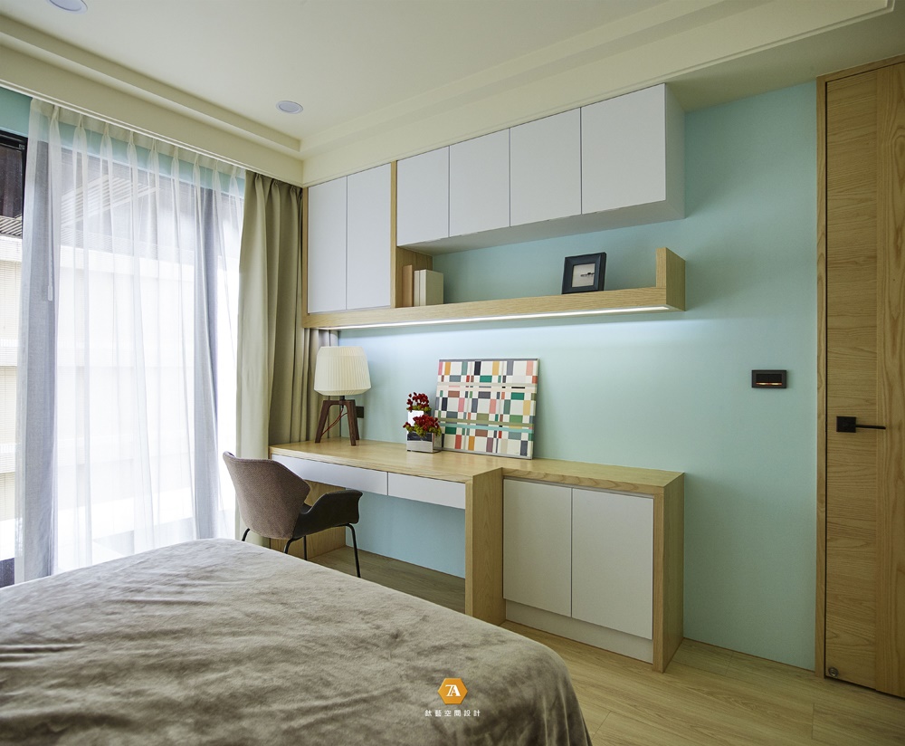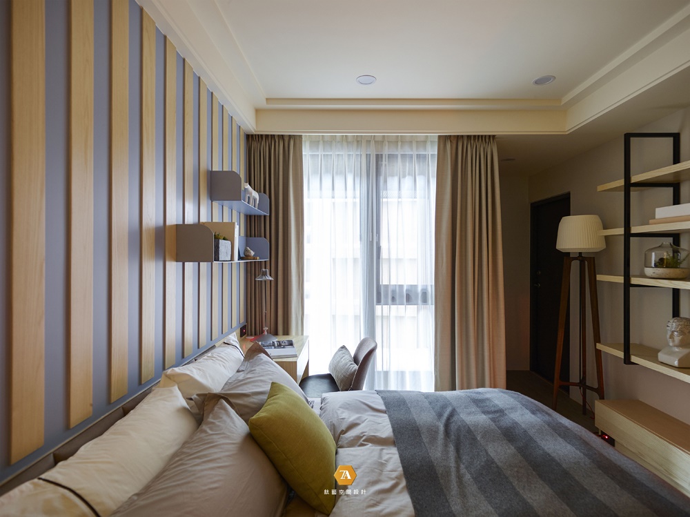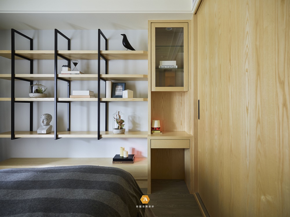 來到臥室,大面積木質地材質,搭配鮮明活潑的色彩,營造出輕松愉悅的空間氛圍,鐵件層架的設計,則打破固有櫃體思維,減少厚重的感官體驗。