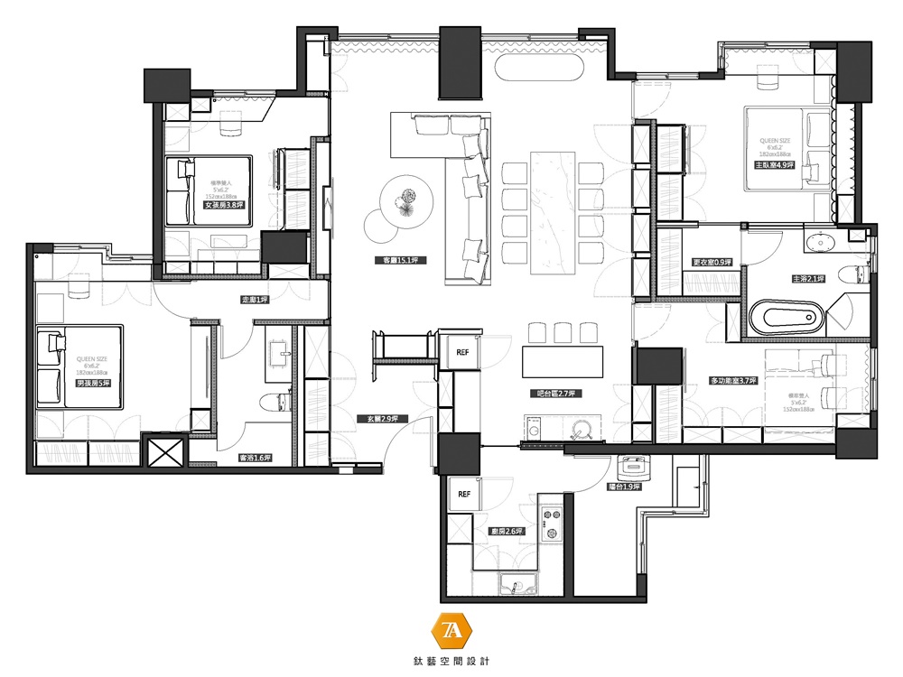 設計總監 汪暉哲 、許家榮 及 創意總監 張瑞克 本次在有限的場所中,精煉多種看似沖突的風格元素,使經典符號不流於空虛復製,進而化身為具有想象力的空間敘事。另外,色彩語匯亦是一大亮點,以公領域的優雅鵝黃基調起始,延伸至烹調區域的黑白對比,進而來到青藍、藕粉及灰色的私領域,於沈靜主題下細微表現個別使用者的深層性格;在展現設計師對於風格及色彩的深切認識,使生活的日常片刻,在這座富饒場景中各得其所地優雅前行。