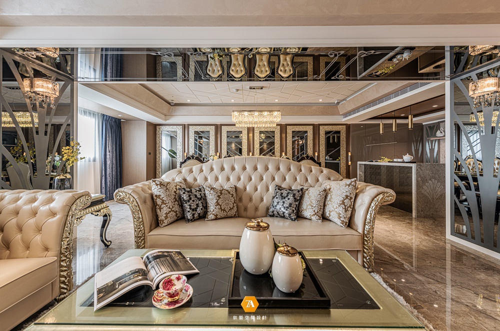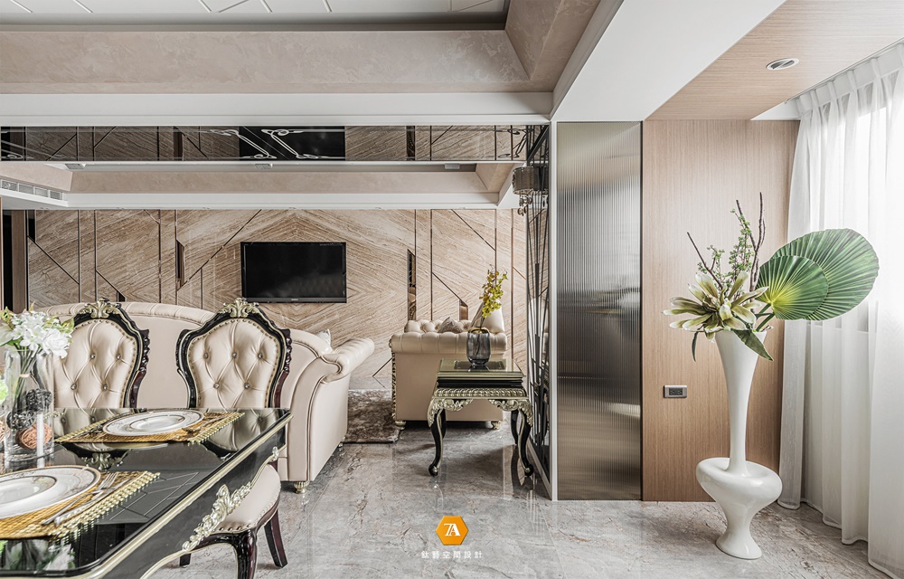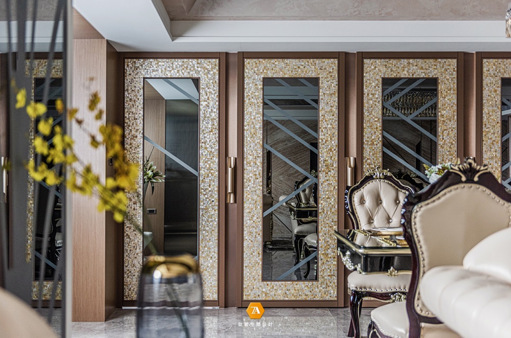 從迷你的 8 坪到寬闊的 80 坪,經手過各式住商空間的設計總監 汪暉哲、許家榮 ,在本案中,與創意總監 張瑞克 一同執筆,處理這座位於密集住宅區的 48 坪中型住宅,以簡練線條精心重塑裝飾藝術的精致風格,搭配鍍鈦茶鏡,及其他天然貝類材料,展現出耳目一新的視覺效果,形塑出貴氣宅邸的豐富表情;並在近似的環境色系中,巧妙地變化場域色彩,為住家精心打理出醒目飽滿,卻未顯半分淩亂的優雅裝扮,使生活在處變不驚的步伐中煥發絕美風采,並加入藝術史中的裝飾時期元素,使得空間具有文化深度,而非膚淺的華麗。
