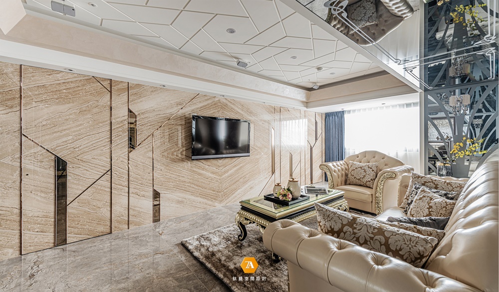 走入公領域,中央主梁采用鏡帶化解壓迫視感,其上化用裝飾主義時期的卷紋,以及在下支撐的樹狀鏡飾,讓鏡面運用不僅止於塊面切割,進而形塑出多層次的細膩視野。此外,亦透過近乎等比的空間比例劃分廳室,使兩處對稱裝設的線板天幕,以簡潔線條重塑古典穹頂的態勢;並延展至有著天然菱紋的石材主墻,整齊劃分的四扇暗門,成為收取藏物及進入臥室的秘密通道;而門片線條則成文飾紋依據,鑲嵌精工切割的線條茶鏡,呈現出帝諾大理石除卻雍容華貴意外的嶄新面貌,輝映燈具投下的柔和光灑,彰顯出家具主墻的貴重份量。天上以梁為界,坐臥則以軟件劃地——設計師精選手藝細致的拉扣和椅件,搭配雕花桌及軟絨地毯,形成和諧且濃烈的異材質組合,標誌出機能場域的邊界及核心地帶。