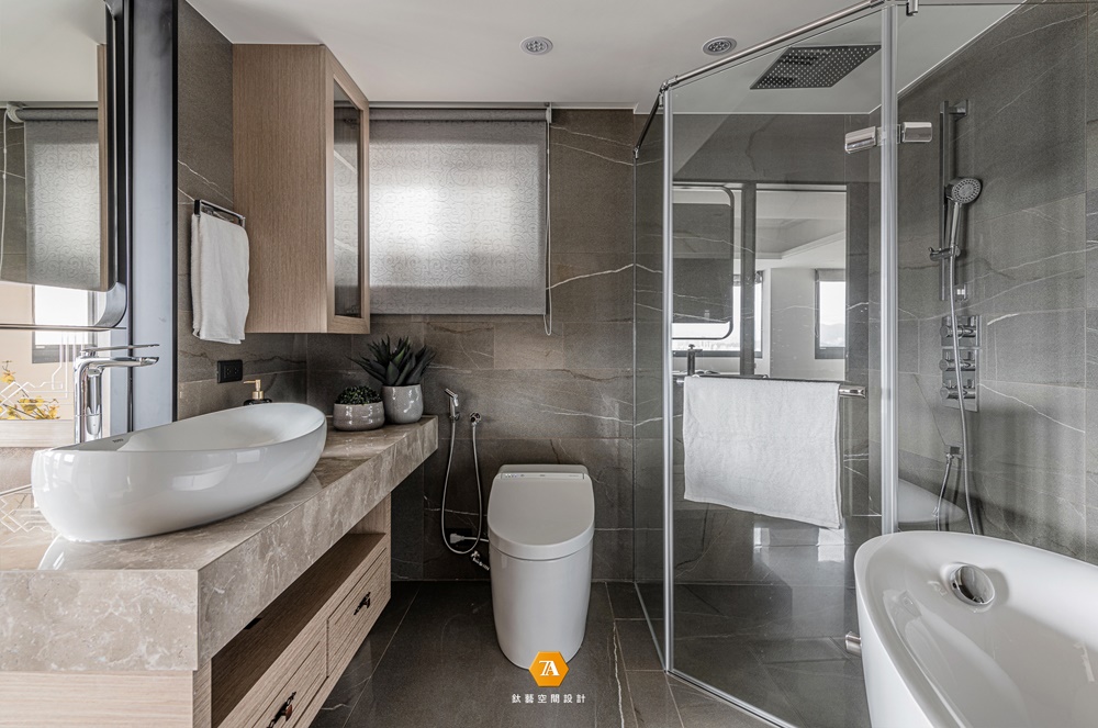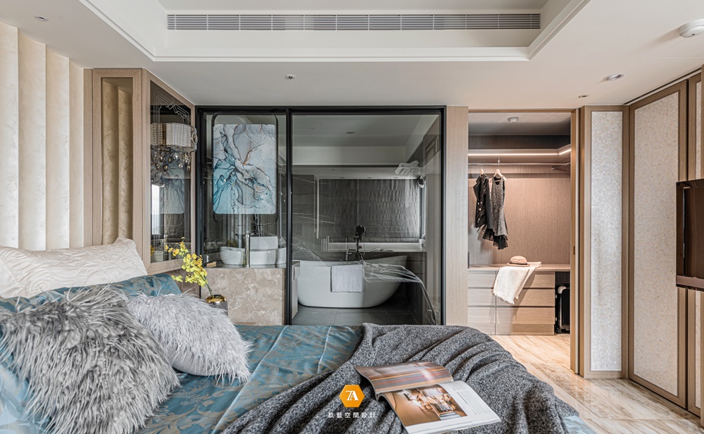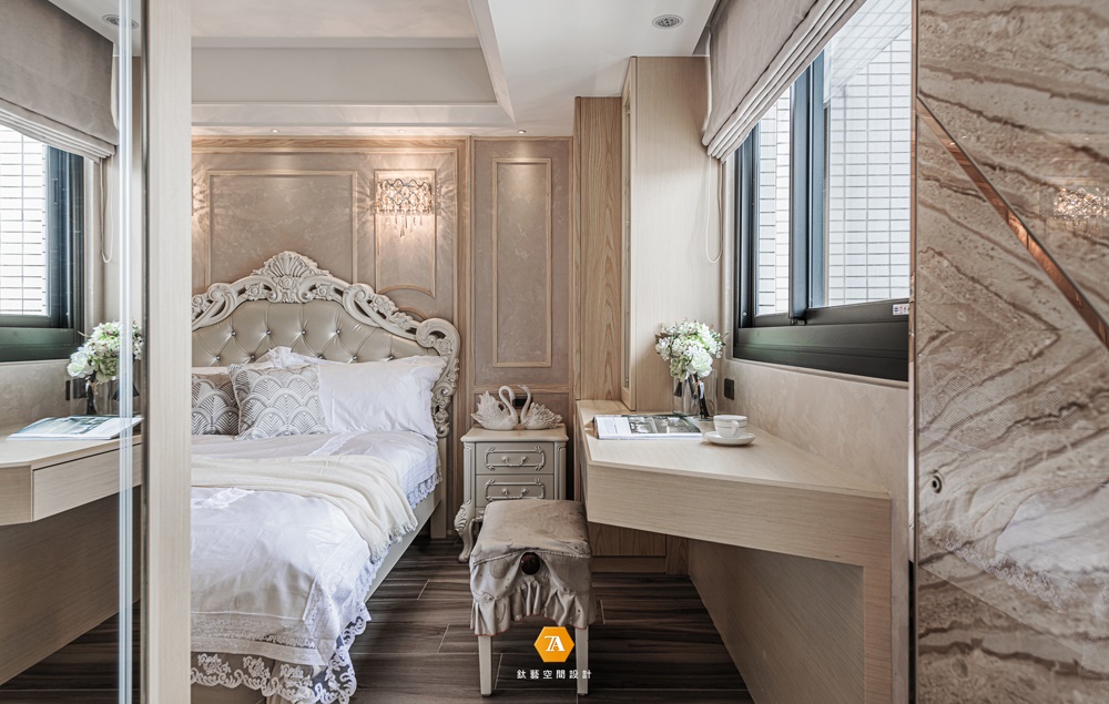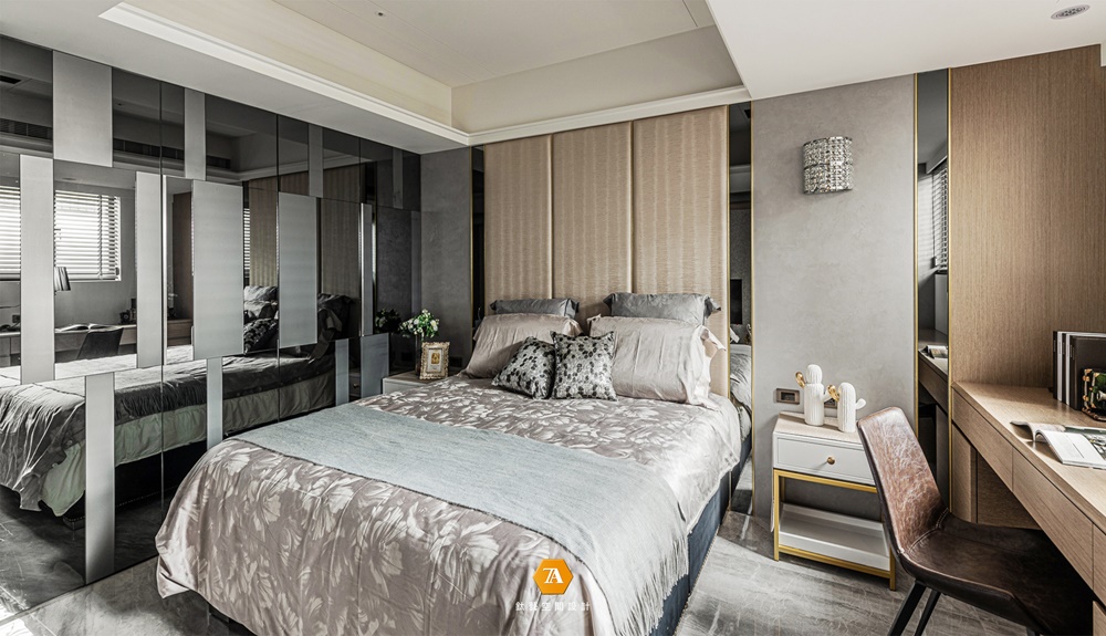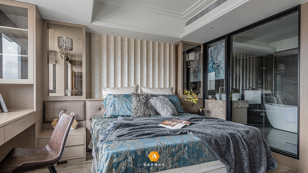 主臥室明確隔間區分出睡臥、洗浴及更衣三大機能,其中浴室以清波門片增加采光,換衣間則采用拉門設計,確保隨心換裝的隱私空間。安排完整體機能後,設計師著手深入細節,延續木紋磚地坪的色彩,於滑門電視墻運用珍珠母貝薄片拼貼,床頭主墻則以波浪立體造型施以藝術塗裝,特殊漆面在曲面反射下,使得每個觀賞角度皆能看到不同的珍珠光彩;臨側的定製書桌及櫃體,采用木質搭建並嵌合大面茶鏡,夾敘位於中央的場域要角——床鋪,為淡雅環境刷上一筆青藍,當每晚床頭燈亮起,便又完成一處剔透的夢幻場景。