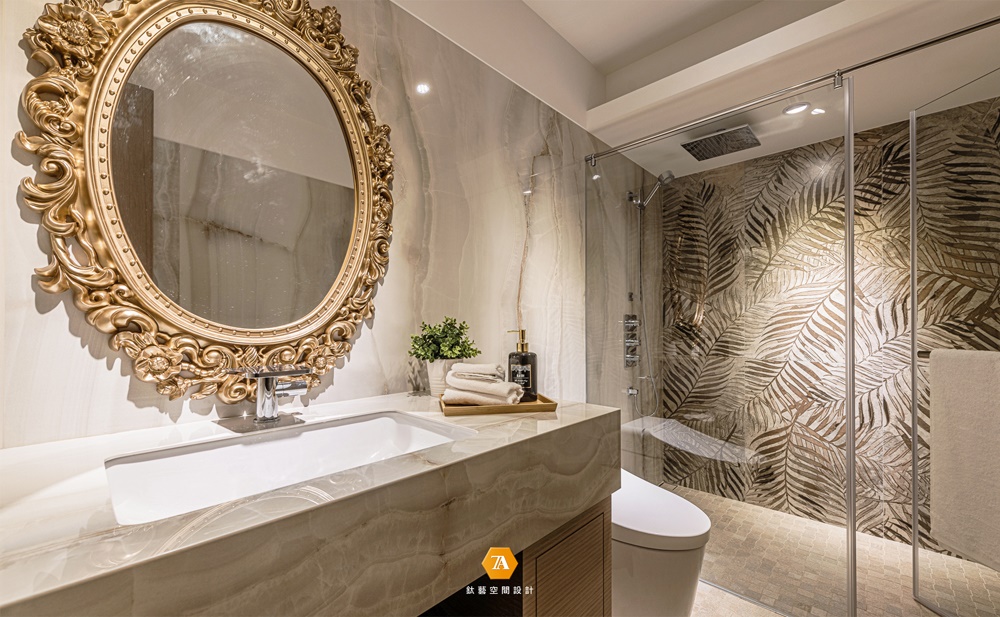 馥郁的草葉壁磚配上梳妝鏡的花草邊飾,接連為簡約場域導入奢華而飽含生命力的美學意象。