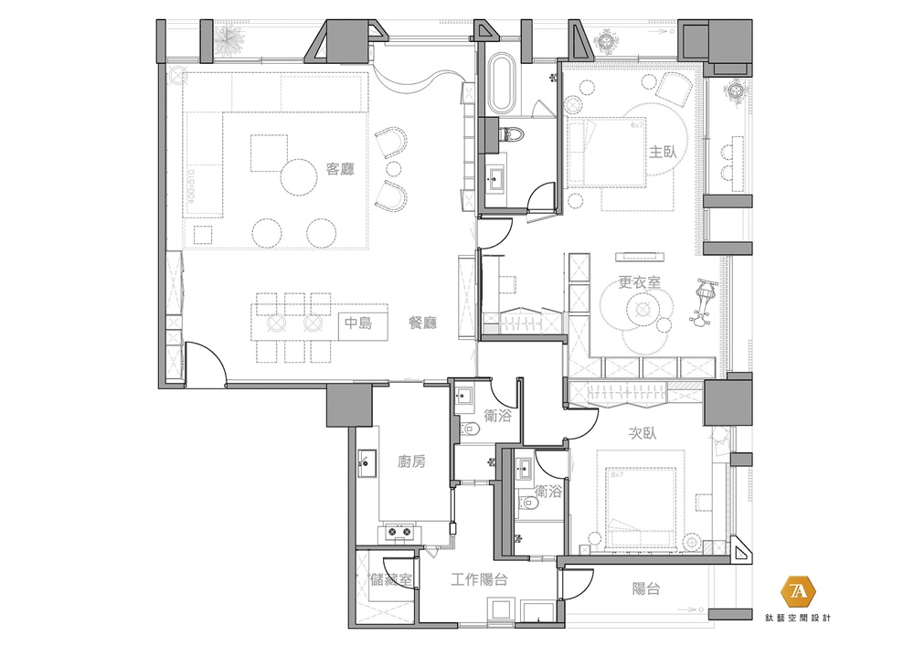 利用不同材质及壁面设计划分场域,客厅中以大量沉稳色调的家具,擘画出深海的静与美,与素雅白净的餐厨空间形成鲜明对比。设计师透过拿捏空间中的结构比例,将天花板铁刀色木梁与墙面利落分明的线条延伸,佐以不同材料质地错置搭配;呈现出缤纷交织的视觉美感,令人目不暇接。