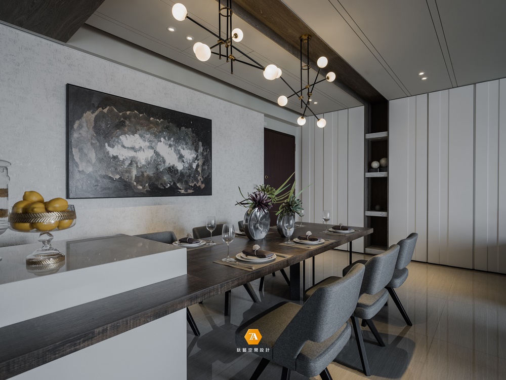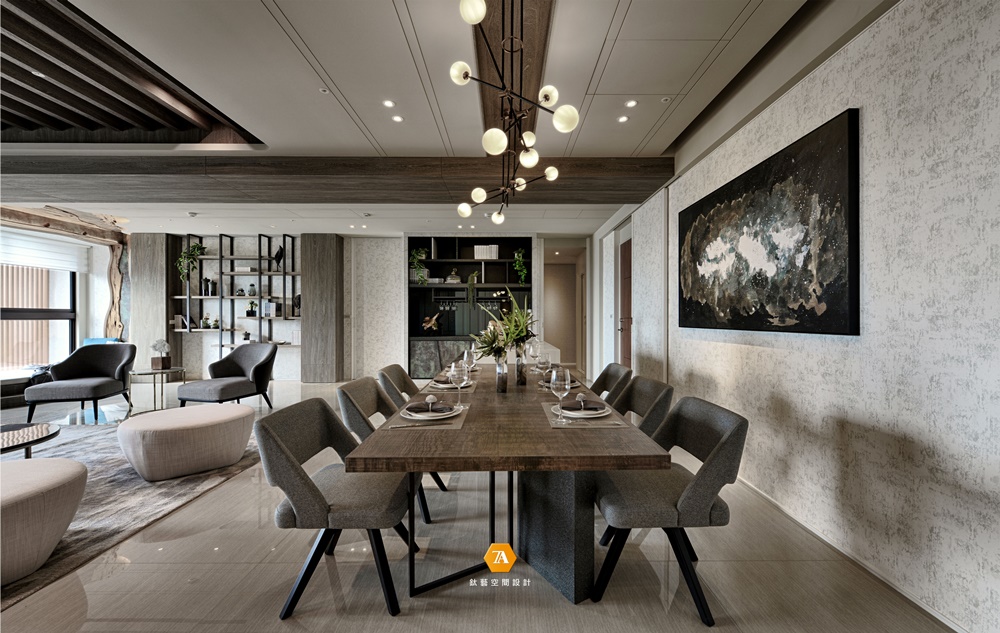 有別於傳統的動線規劃,進門映入眼簾的是寬敞的用餐區域,想象回到家後餐桌上的美食佳肴與家人的歡聲笑語迎面而來,一天的疲憊頓時忘卻。沈靜色調的木質餐桌,搭配不規則圓潤燈飾的點綴,為用餐時光灑下陣陣暖意。墻上的意象畫作與後方的展示櫃相互呼應,構築成一幅自然光景,作為後續空間的前沿鋪陳。