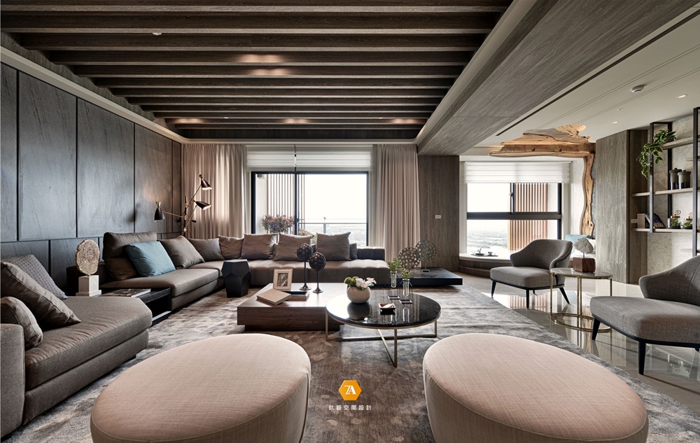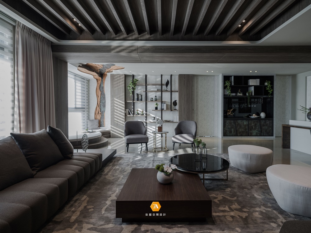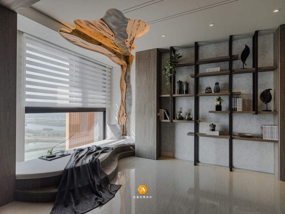 大片玻璃落地窗,映出窗外的遼闊景致;土褐色絨質地毯,鋪張出一席海中沙洲意象,與角落的的樹形臥榻融為一體;多樣豐富的木質色層次運用於櫃體與地壁面,加深自然感知與心靈沈澱。設計師以空間為雕塑品,天花板及壁面采鏤空設計,註入攀援而上的樹景意象,刻劃出自然樣貌;拾階座臥,眺觀海景,感受貼近水天一色的自然情致。