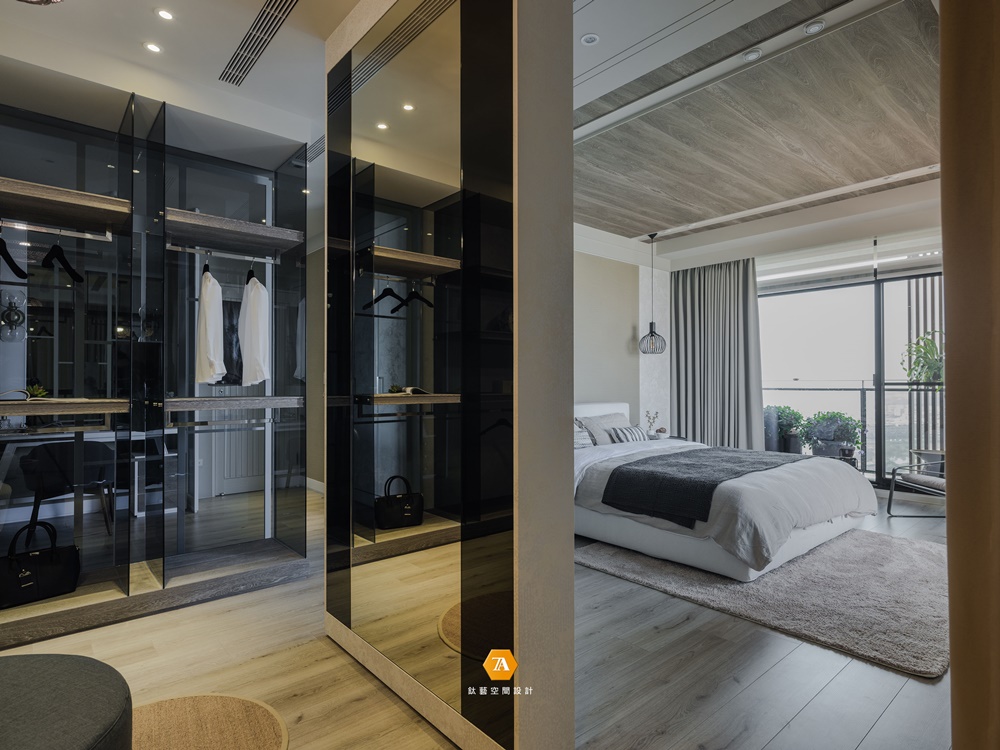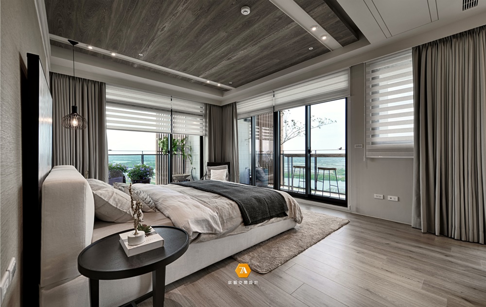 踏入主臥,隨著L型動線,逐步感受敞朗明亮的空間感受,大片視景仿若度假般的悠閑適意。延續客、餐廳的色調,整體仍舊采以雅致木質為主,床頭上方的和煦吊燈,圍塑溫馨滿溢的舒眠氛圍。落地窗外的陽臺空間,形似觀景臺,俯瞰一線風光;暫別都市的喧囂,寄情於山水間;晝時聞鳥鳴而醒,夜晚攬明月而眠。