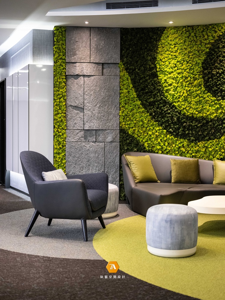 除了在迎賓大廳構築自然意象,設計師也采擷相應元素挹註廊道,形塑令人難忘的沿途景色。立面采用質地粗獷的石材,拼貼出凹凸不平的推砌感,於光源映照下,更加深了巖壁的光影變化;搭配竄生其間的植栽,引人仿若回到野地,輕吐著森林香氛。往前再進一步,如曲水彎折的多層次綠簾接續現身,線穗由柳黃色漸次轉白,表現出寧靜襯底的動態感受,並承托出空間的核心角色——鮮明的品牌字樣及團隊目標鮮活現身,讓企業理念不僅深植每位工作夥伴心中,亦化為辦公場域的最佳妝點。