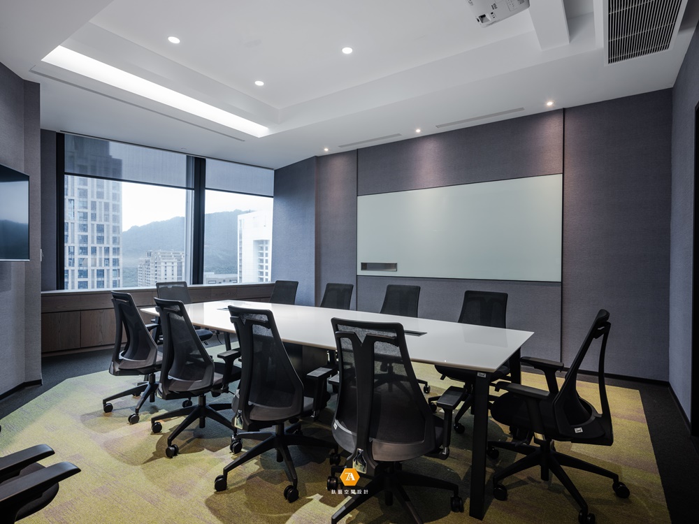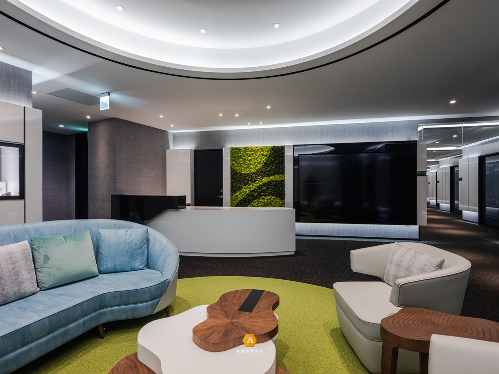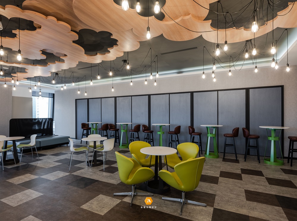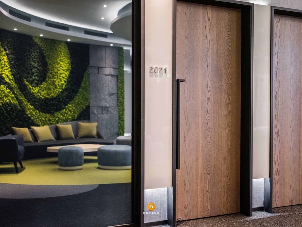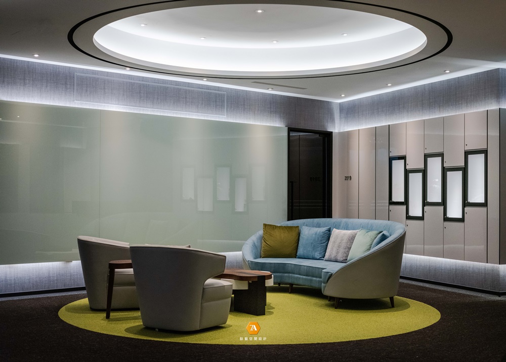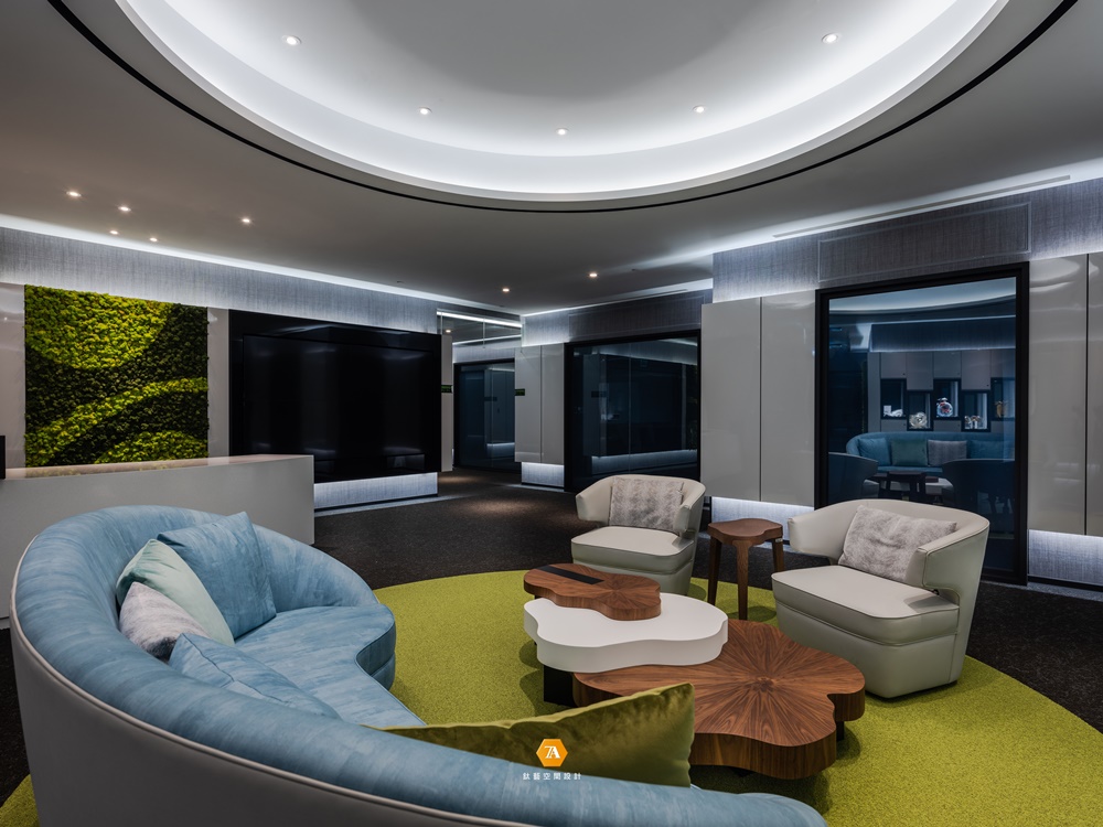 隨著探索的步伐邁進,明朗而開闊的通道將人引領至多功能區域,打破放松氛圍與辦事效率無法兼容的刻板印象;並以招牌的「綠點」作為場域劃分的弱分界,將實木桌幾與棉布沙發溫馨地圍聚一處,其自然舒展的漸層紋理,使環境的舒心氣氛更加飽滿。而設計師另規劃了獨立的多功能間,於穩重的木石基調中,草綠及天藍色轉而作為點綴,圍塑出舒服而隱密的空間;既能作為小型派對地點,也能是外賓演講的所在,使場域於松緩愉悅的主調中完備多種機能。