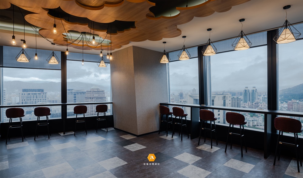 長型茶水間伴隨一整墻的落地窗,營造寬闊的視野,搭配暖黃光源與大片木質,亦交織出咖啡廳般的放松氛圍。