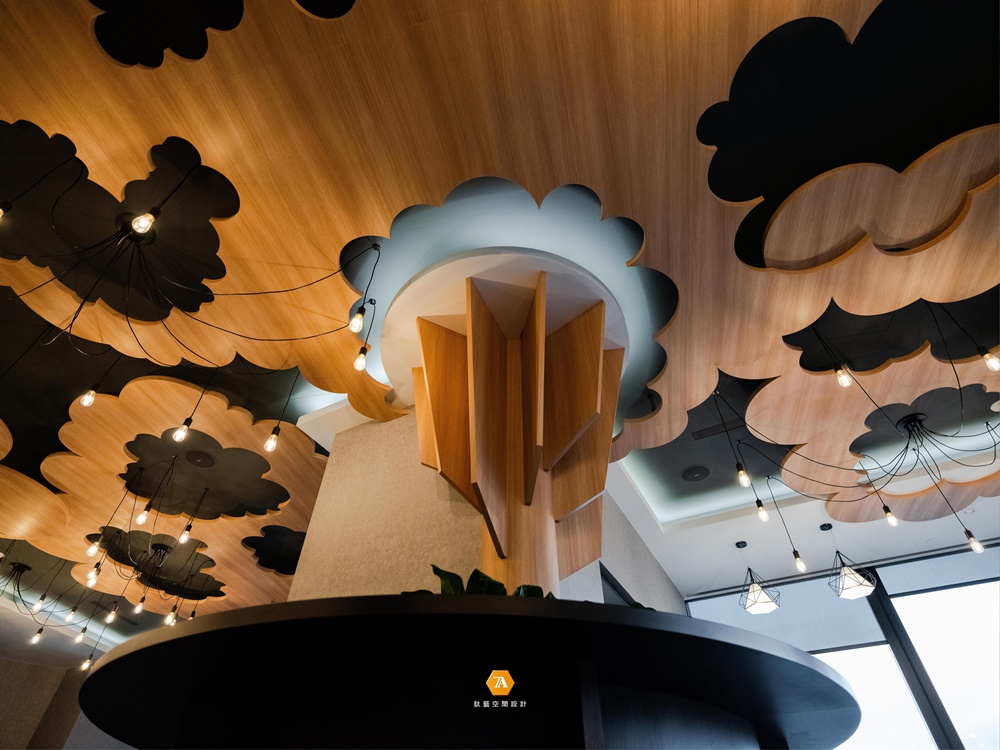 員工辦公時的心理狀態要照顧,用餐時刻當然也不能忘。員工餐區轉化直述「綠」的設計手法,以一顆全木質的「主樹」為中心,向上鋪展出雲朵般的高低層序,從樹根的角度看去,亦象是籠罩於枝節繁茂的樹翼之下;巧心的鏤空造型使裸露天幕隨處隱現,讓視野隨之開放;而盞盞看似隨性垂吊的復古燈具,加之四面開窗所透入的溫暖采光,將明媚灑落人們的胸廓,進而使夾於事務間的中場休息,獲得徹底緩解。