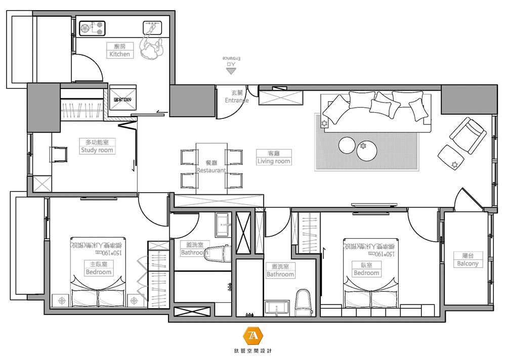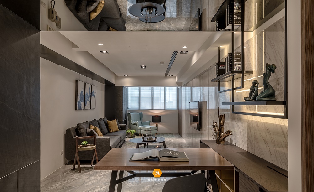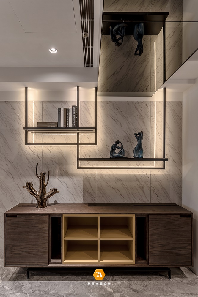 大門、玄關、餐廳這三個場域互相連結。玄關采用鐵件、木飾面、燈光作為端景造型;餐廳餐桌與餐邊櫃結合,將餐廳空間達到最大化利用率;大門則因為原有建築結構大梁橫跨餐桌上,所以采用特殊金屬鏡,透過視覺反射的手法,將壓梁的視覺感淡化。