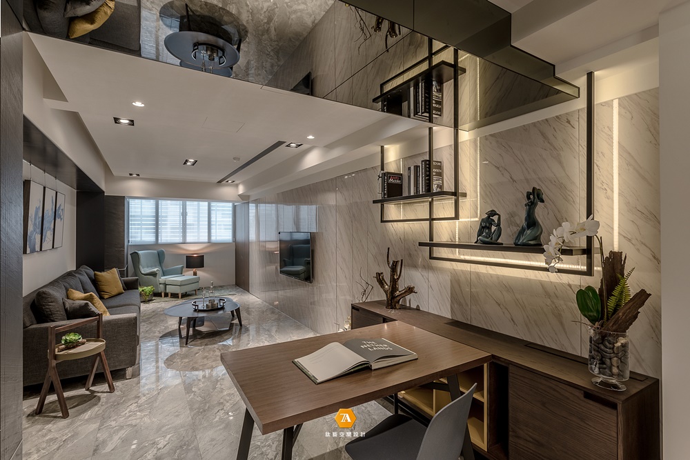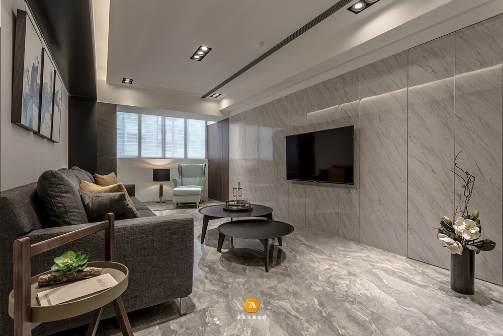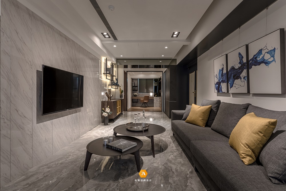 狹長的客廳格局,透過電視墻面分割比例,與淺色天然大理石的質感呈現出屬於豪宅的尺度與氣場。