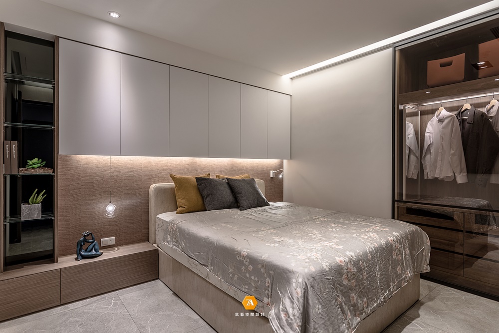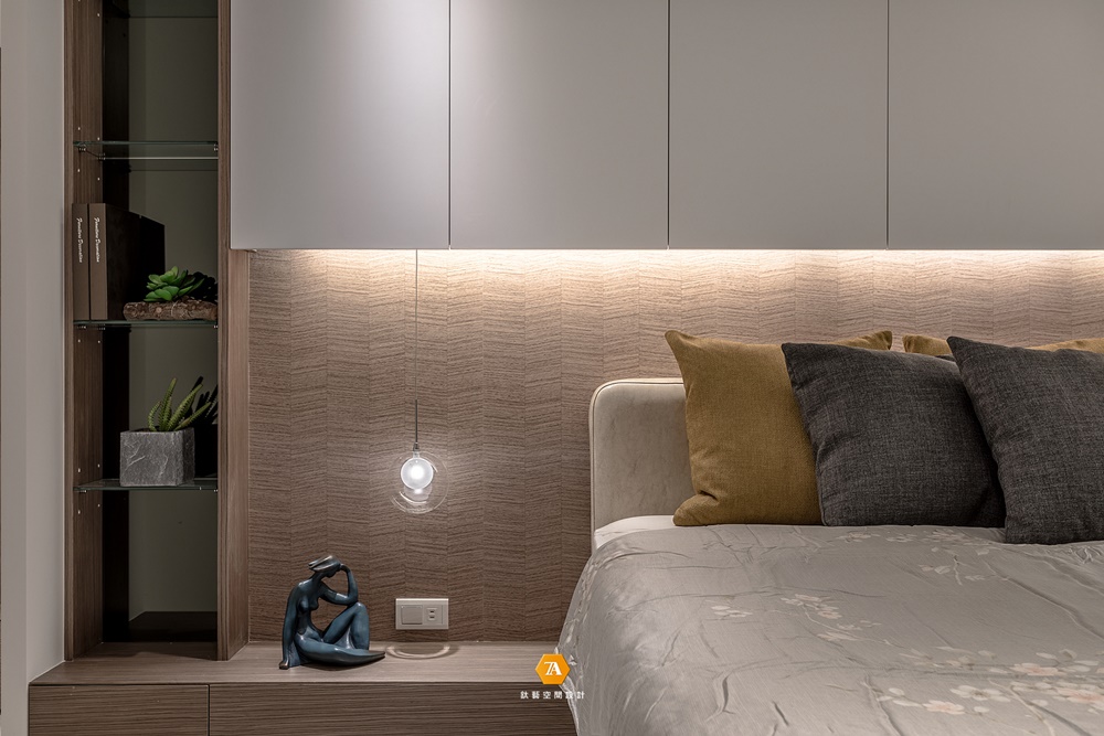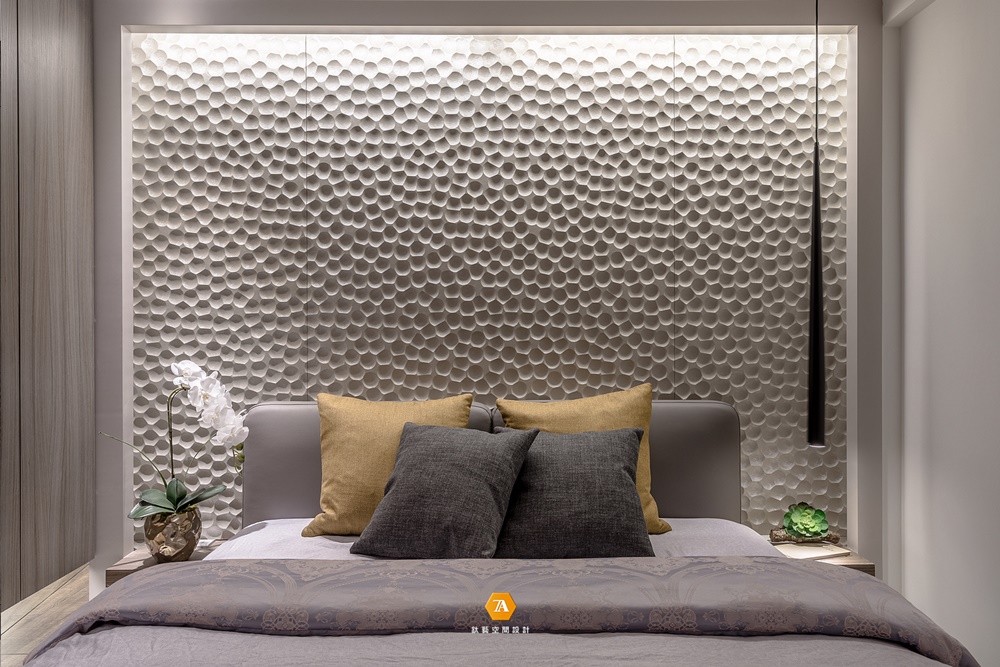主臥室床頭特殊建材的發想則是因為男主人喜歡浮潛,所以設計師將珊瑚礁的意象置入,讓客戶仿彿沈浸在海洋中。