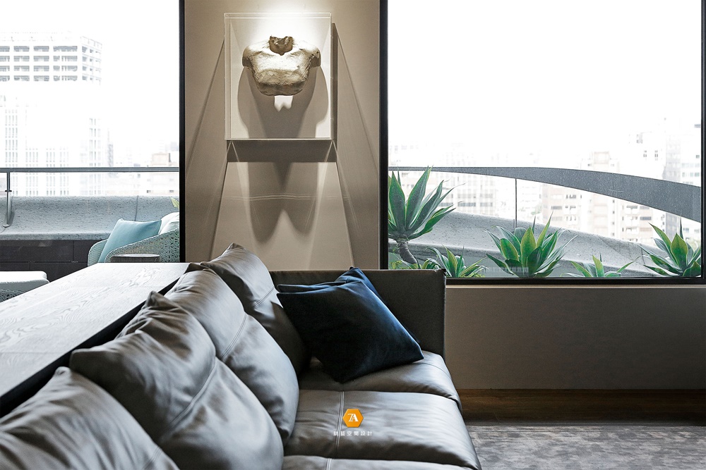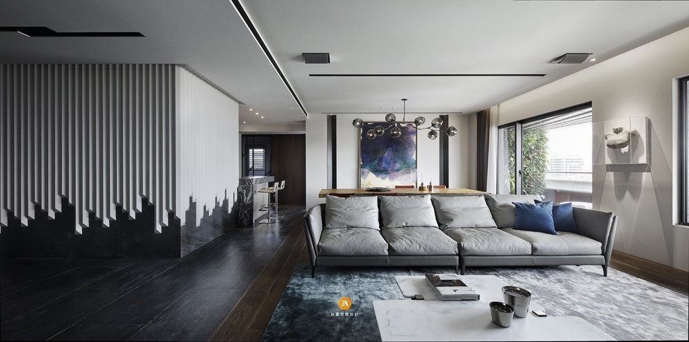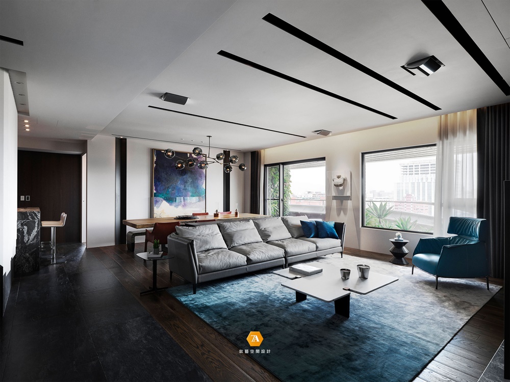公領域地面利用不同地材象徵場域的分區,廊道區以黑色水染木皮鋪塑行走動線,客廳及餐廳作為凝聚家人情感的場所,則採用質潤的木材圍敘圓滿的團聚時光。並於大片冷色系的基調中,利用地毯、沙發、椅件、畫作等軟裝家飾品,點綴空間的鮮活表情。憑藉得天獨厚的充沛採光,與戶外陽台的自然綠景,使整體空間散發勃勃生機,讓身心得以沉潛,靜享宜人時光