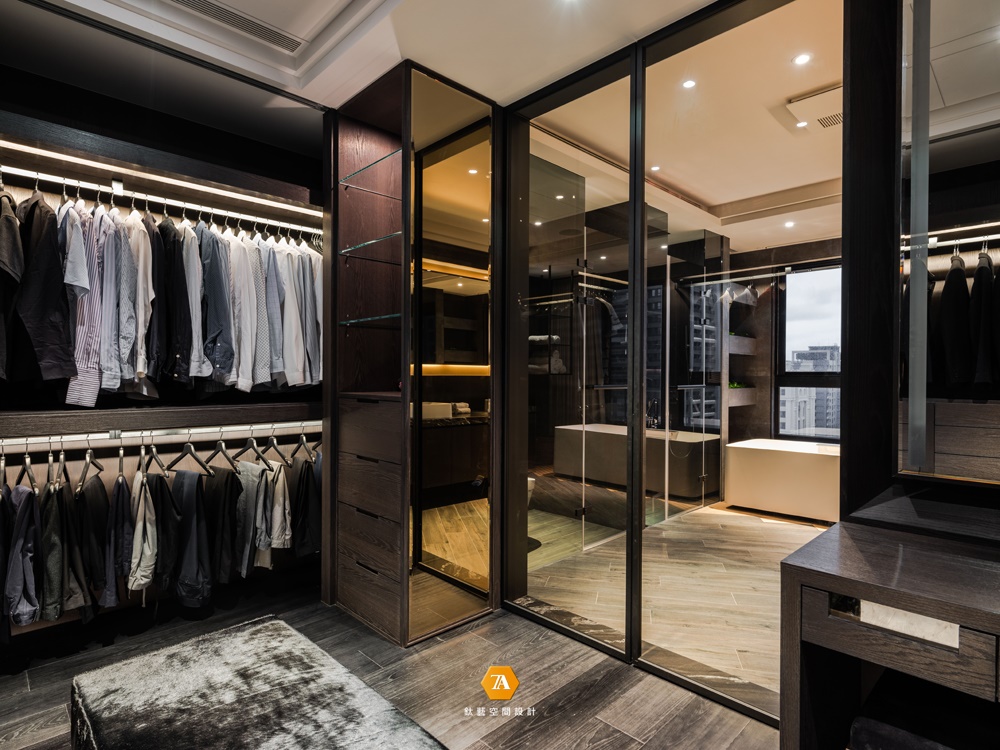 轉折進入主臥內部,行進更衣室後便是衛浴空間。此處原先並非面朝公園綠景,設計師調整牆面與衛浴管線,讓光線和空氣共同參與沐浴梳洗的時刻,完美營造紓壓情境。而為打造客戶所喜愛的日式飯店情境,設計師特意置放一座獨立浴缸,並鋪設檜木地板呈現其意境,遇熱水時更能散發天然香氣。取意為境,倚躺其中,暖黃光源隨鏡面反射映照,場域情調亦隨著氤氳熱氣蒸騰,繚繞不去。