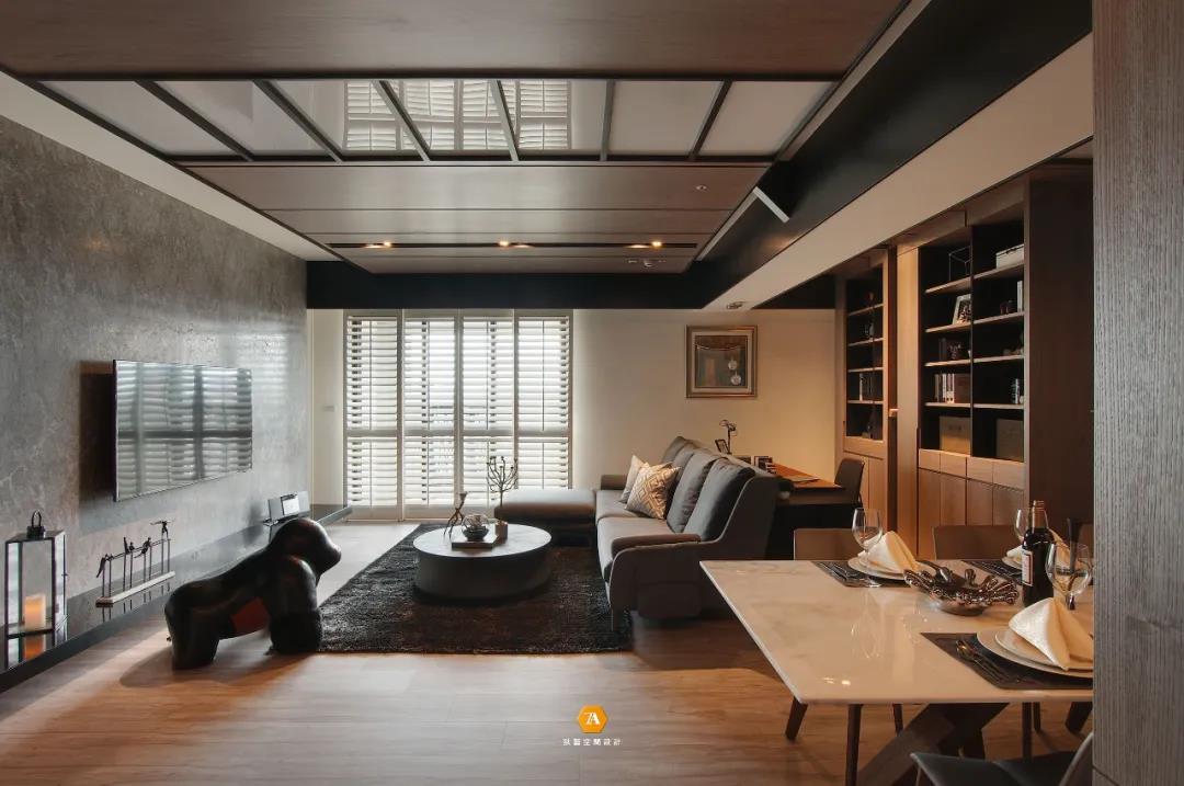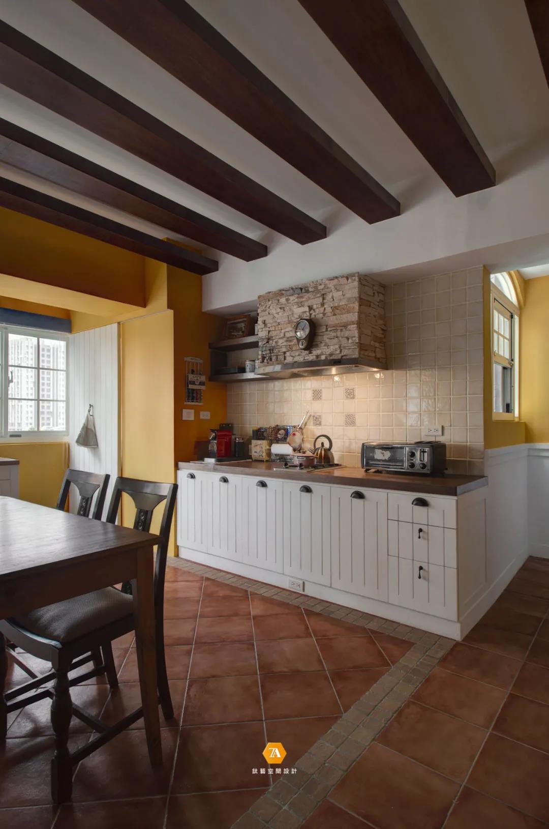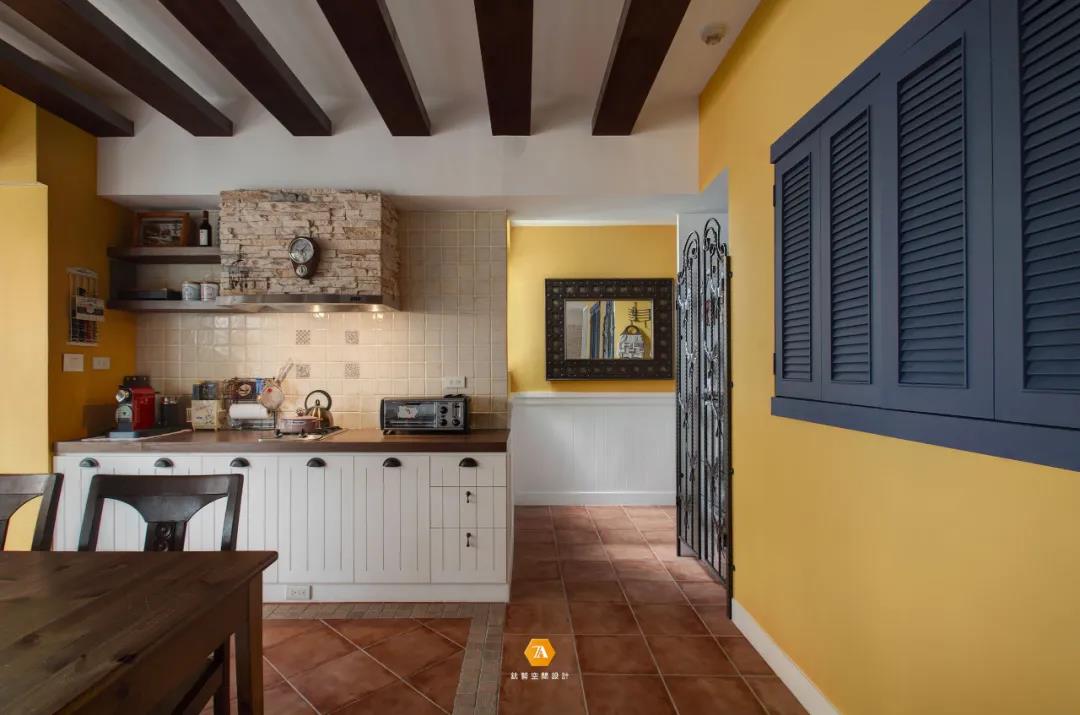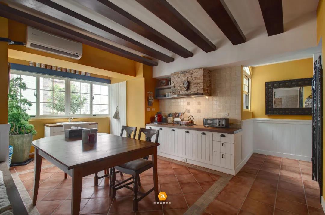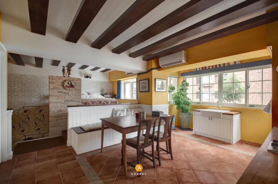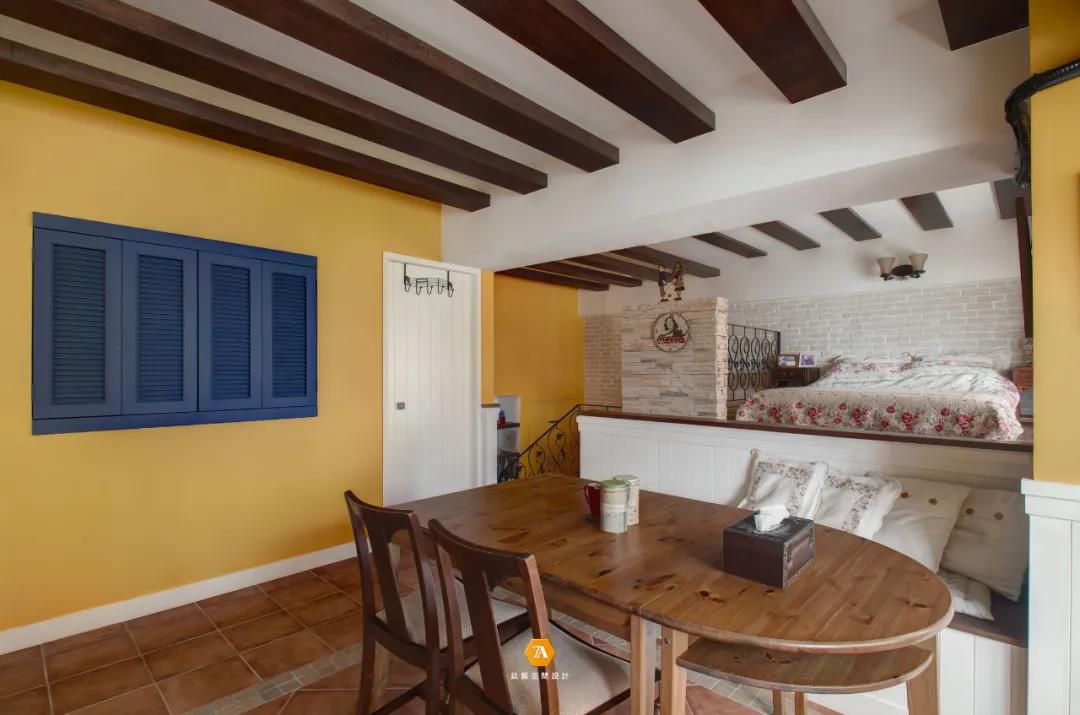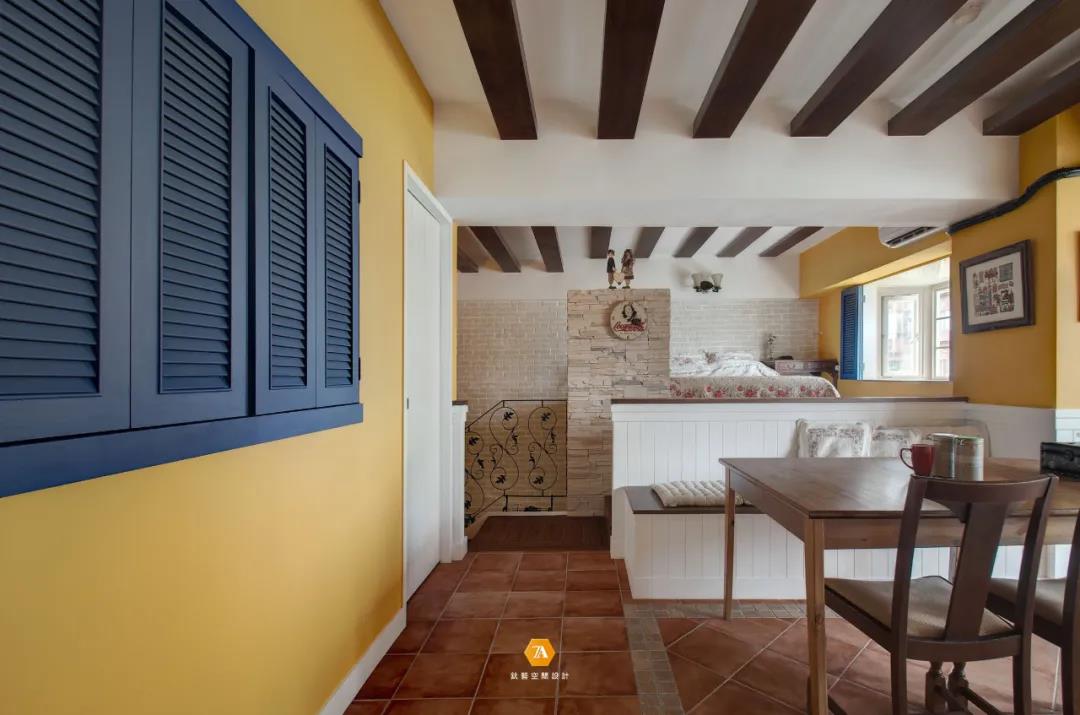 而土黄色墙面也随之从玄关向内蔓延至整个空间,奠定了整个空间浓浓的“乡村”氛围基调,宁静舒适。餐桌以卡座的形式表现,尽可能的使空间放大,而在电视墙的设计上,设计师用百叶窗的造型来巧妙隐藏电视,使空间保持一种整洁干净,淳朴原始的感受。天花以体积庞大、质地厚重的粗犷木材,均匀的排列于整个空间之中,让本是淳朴的空间稍显气派,带来不同的空间感受。