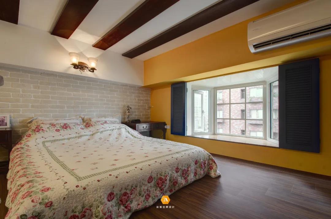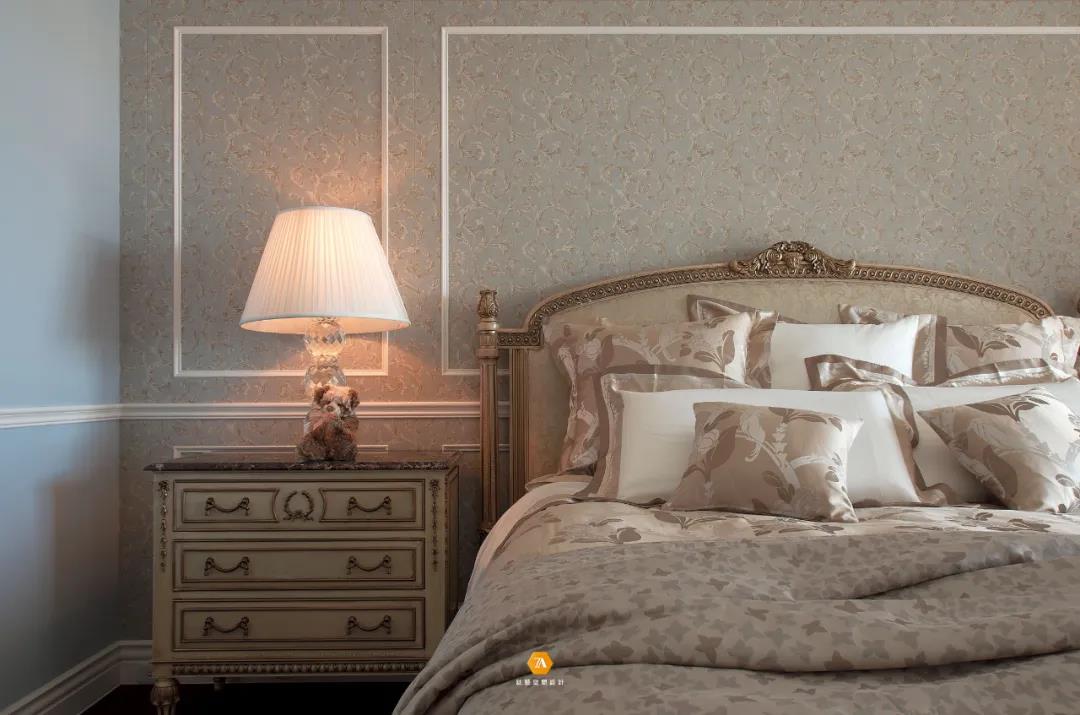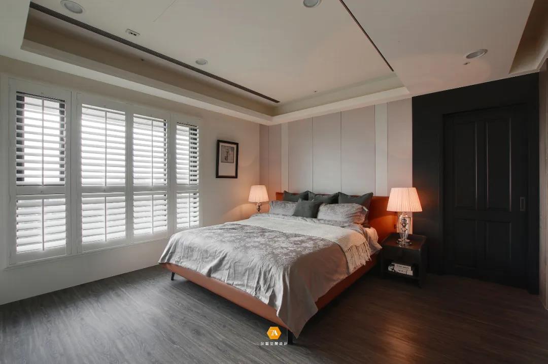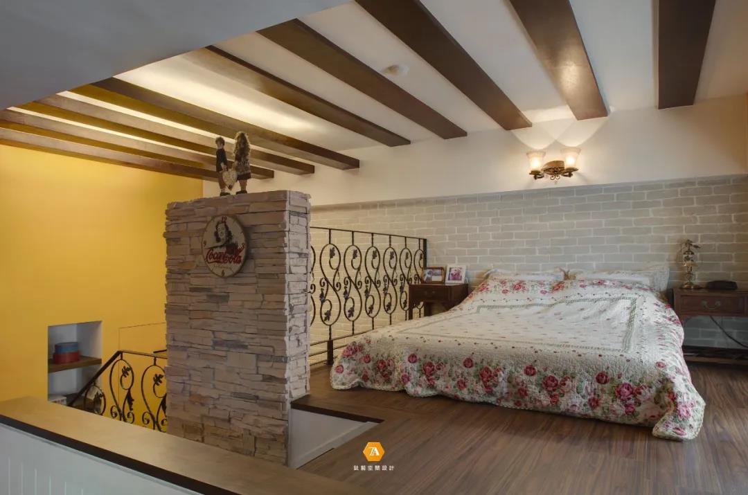 设计师在卧室的设计上,通过与业主的沟通交流,得知业主少有在家中接待客人的习惯;因此,设计师选择以开放式的手法,将私领域与公领域相互连通,进一步拓宽空间。铁艺护栏与深色温润的木地板,一方面划分了空间区域,另一方面又加重了美式风格的氛围,无不透露出设计者的处处细腻心思。