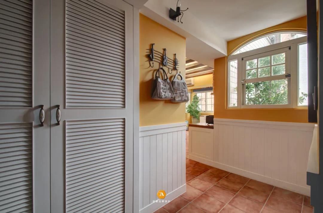 推开大门,一眼便能看到美式风格中最具代表的元素之一——百叶门板,百叶的运用,不仅让人在步入空间时便能感受到浓浓美式气息,也增加玄关走道两边的通透性;同样设计师为了增强空间中美式乡村中,“乡村”的感受,在墙面以美式风味线板搭配土黄色墙漆,将浓郁的乡村气息进一步提升,让步入空间中的人,都能有到舒适,惬意的氛围感受。
