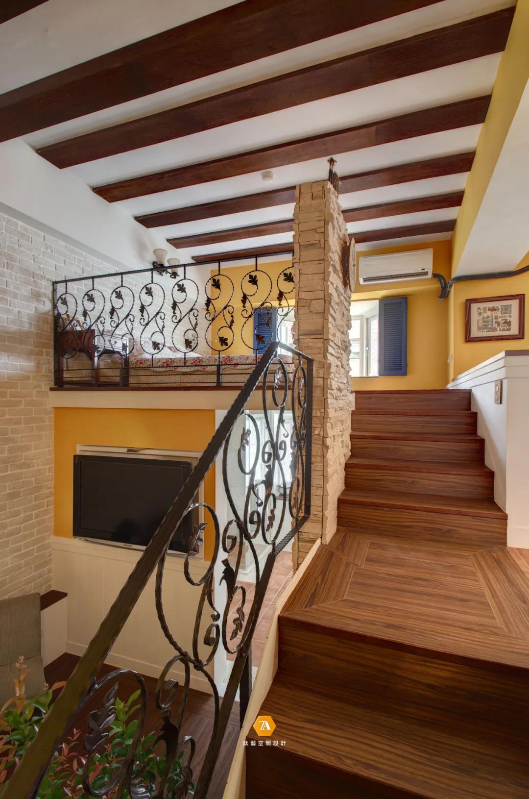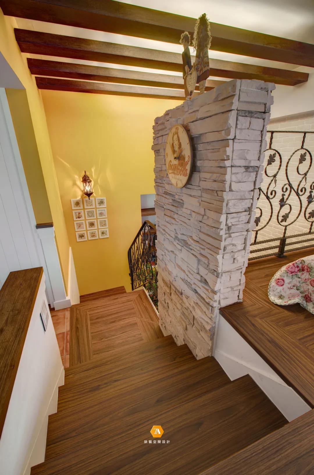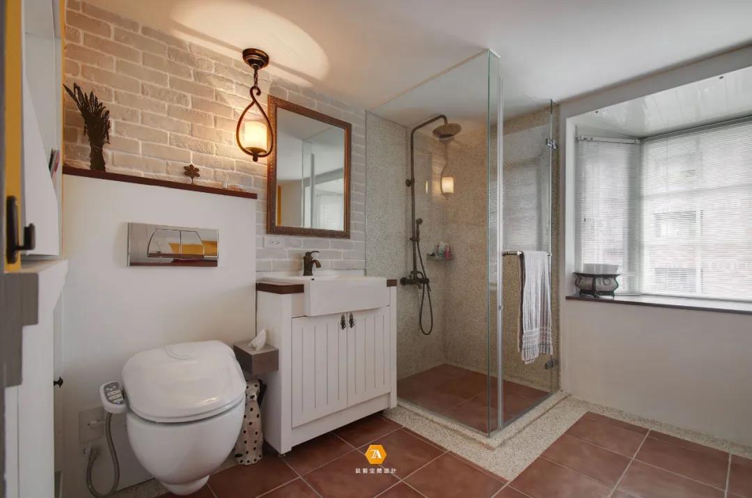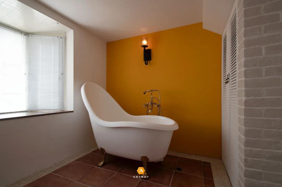 因住宅建筑本身的结构原因,所以卫生间被布置于卧室的下方,而设计师通过铁艺楼梯,同样将美式气氛,蔓延至卫生间区域。卫生间延续空间色调,以土黄色墙面突出浴缸背景,其他墙面以文化砖烘托,搭配复古铁艺灯软件,让人在空间中,除去一天的疲惫,放松心境。