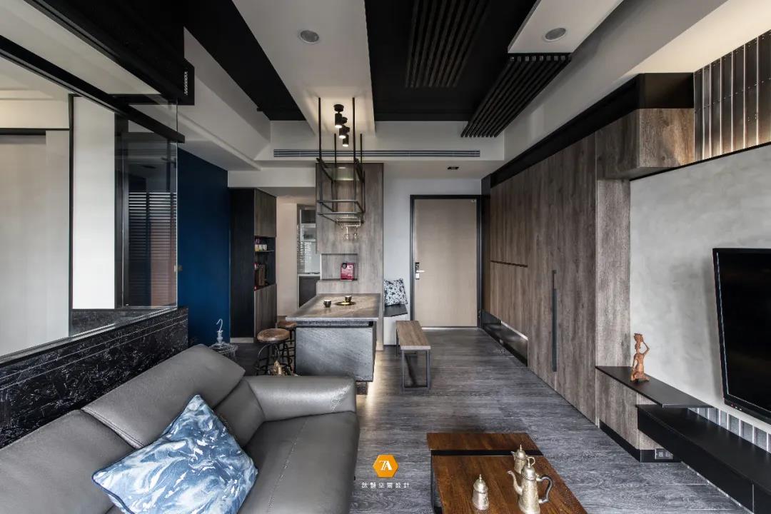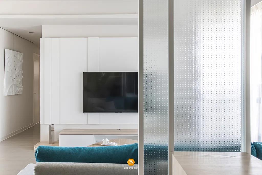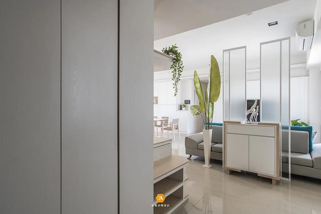 由玄關展開清新自然的空間篇章,簡約機能的鞋櫃,方便了業主一天疲勞工作後回到家中替換鞋履,也將其引進這放松空間之中 。現代鐵藝點狀玻璃屏風,弱化了從玄關望向室內的視線,營造出一種朦朧美的視覺感受。