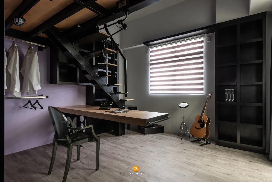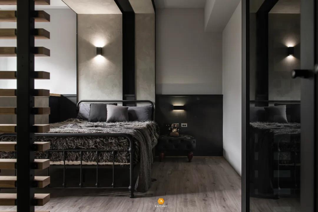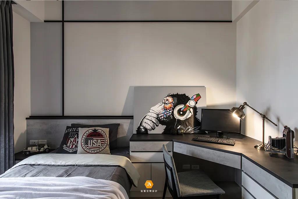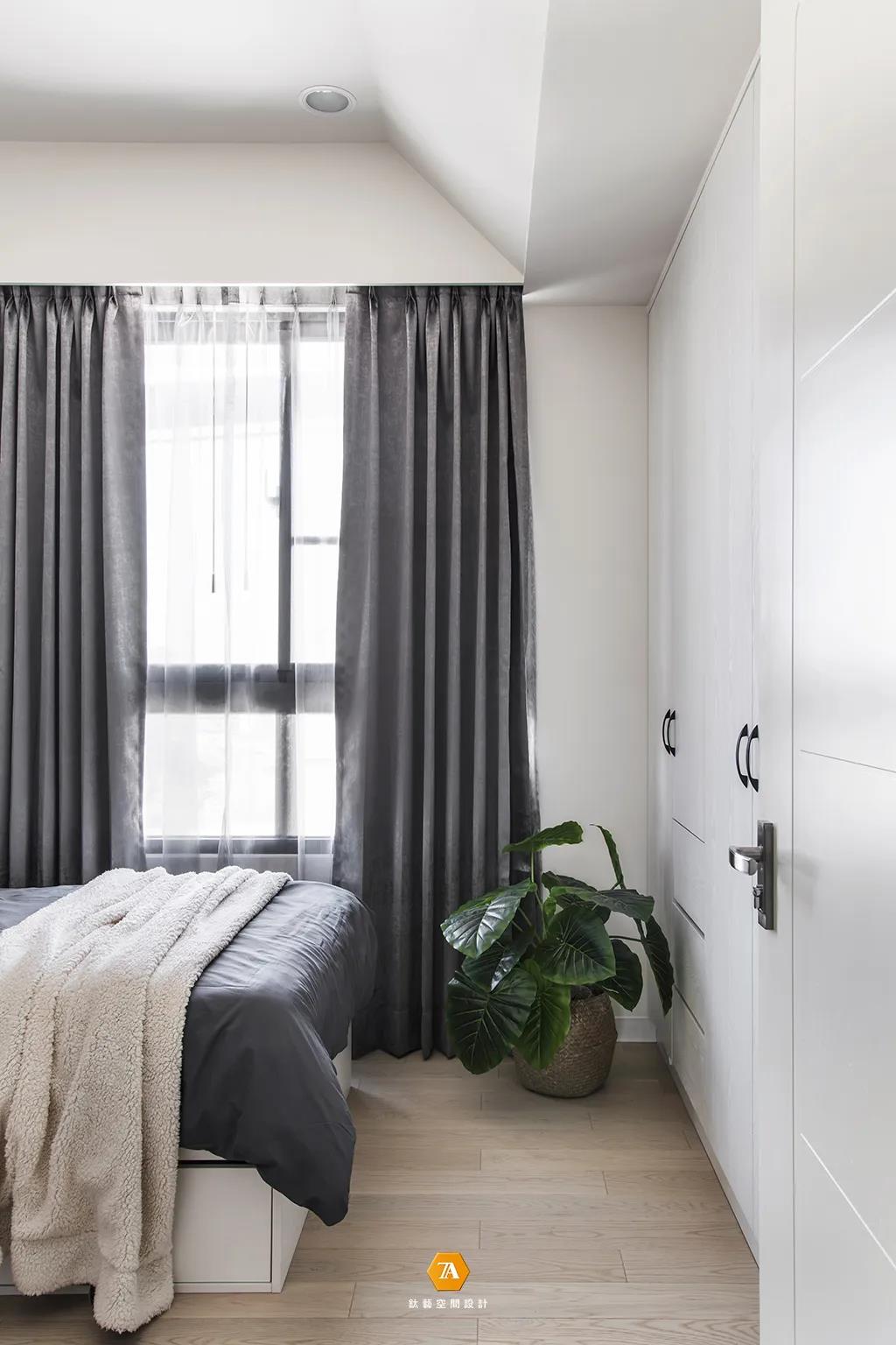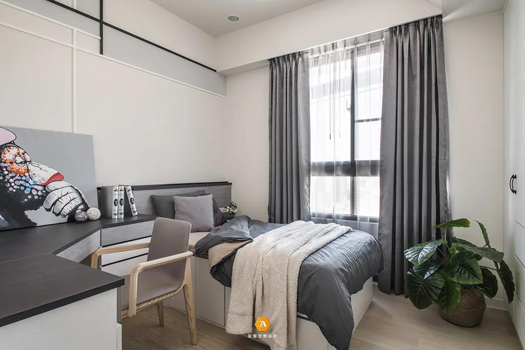 臥室以黑白灰為基調,墻面為白色,而家具窗簾等則選用黑灰,搭配線條造型的床頭背景,簡約時尚的空間感受,便展露出來;躺在床上,看著潔白的天花,於這個空間之中,思緒便飛向遠方,整個身心都於此刻完全放松下來,無暇顧及這喧囂的都市所帶來的煩擾。