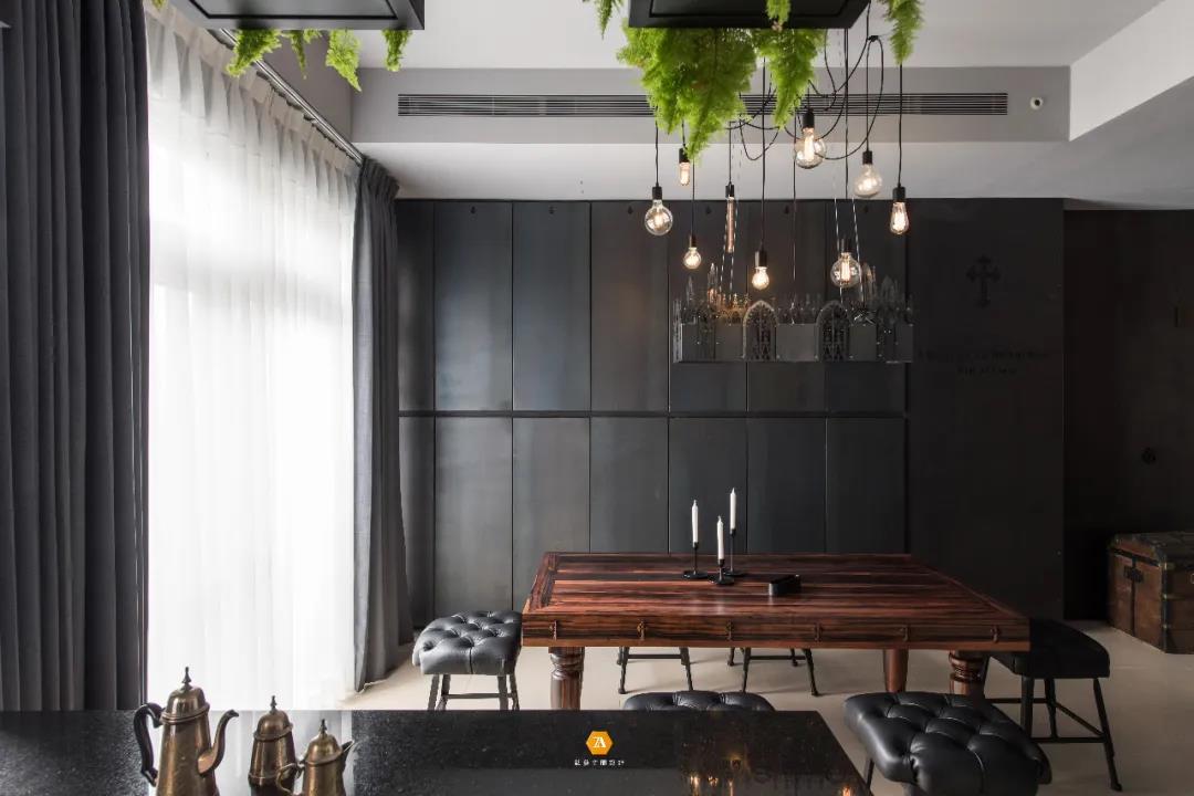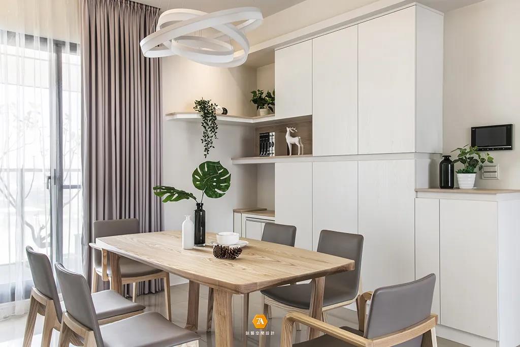 餐廳采用開放式廚房的設計,為了區隔廚房與餐廳的空間格局,設計師在天花上下了點小心思,以與家具同種木質地,勾勒出整個廚房的格局,同時中島的設計也讓空間的現代時尚感迸發出來,讓身心感受遊走於這輕松愉悅的空間之中;木質餐桌以及半開放的餐邊櫃,搭配些綠植盆栽,使得自然氛圍在無形中與整個空間融合,自然所帶來的寧靜感受,溫潤的滋養著在此的每一位居住者。