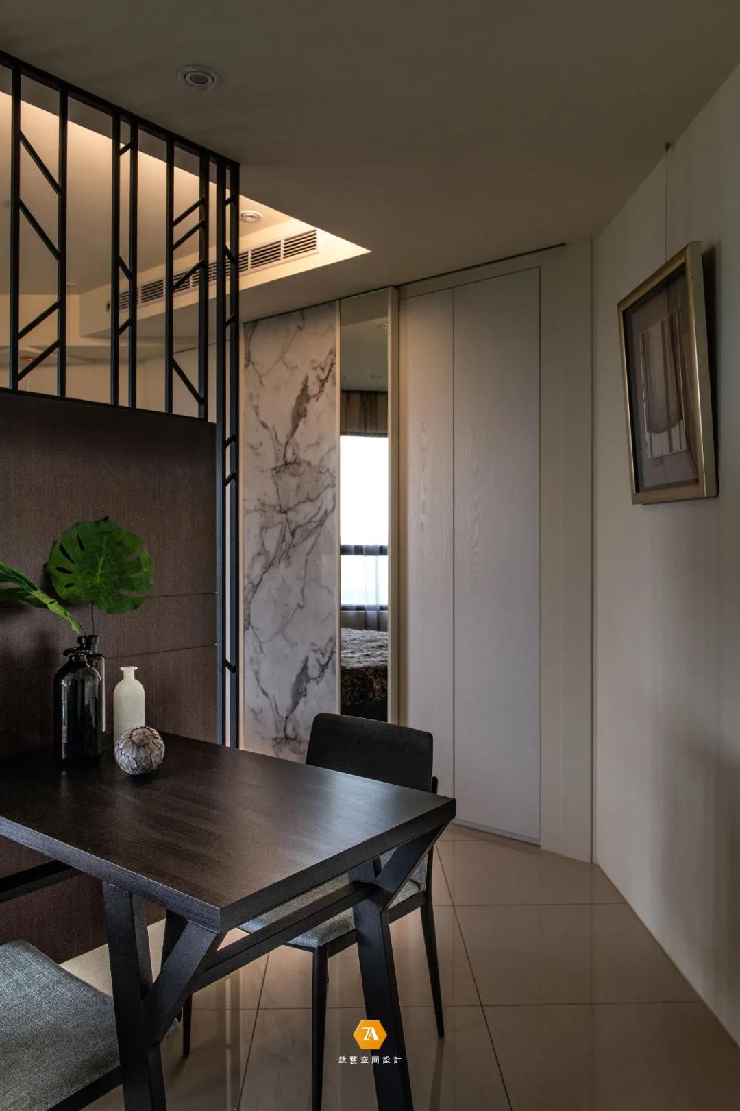 比鄰玄關與客廳的餐廳。輕巧簡潔的雙人餐桌,不僅減少了家具對有限空間的過度占用,也讓整個空間在視覺上得到拓寬,消除擁擠的感覺;而餐桌旁的鐵藝隔斷,搭配木皮裝飾,在空間材質上產生跳躍感,也無形中將餐廳與客廳區隔開來。
