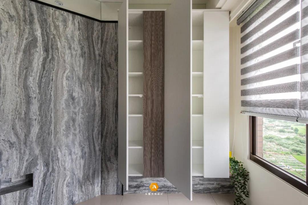 主臥衣帽間采用隱藏門的設計手法,讓空間趨於完整的同時,而簡潔完整的空間,也讓使用者在身心上感覺空間被放大;T字形的衣桿設計,則最大程度的利用了掛衣的空間,讓更多的衣物能夠得到收放。