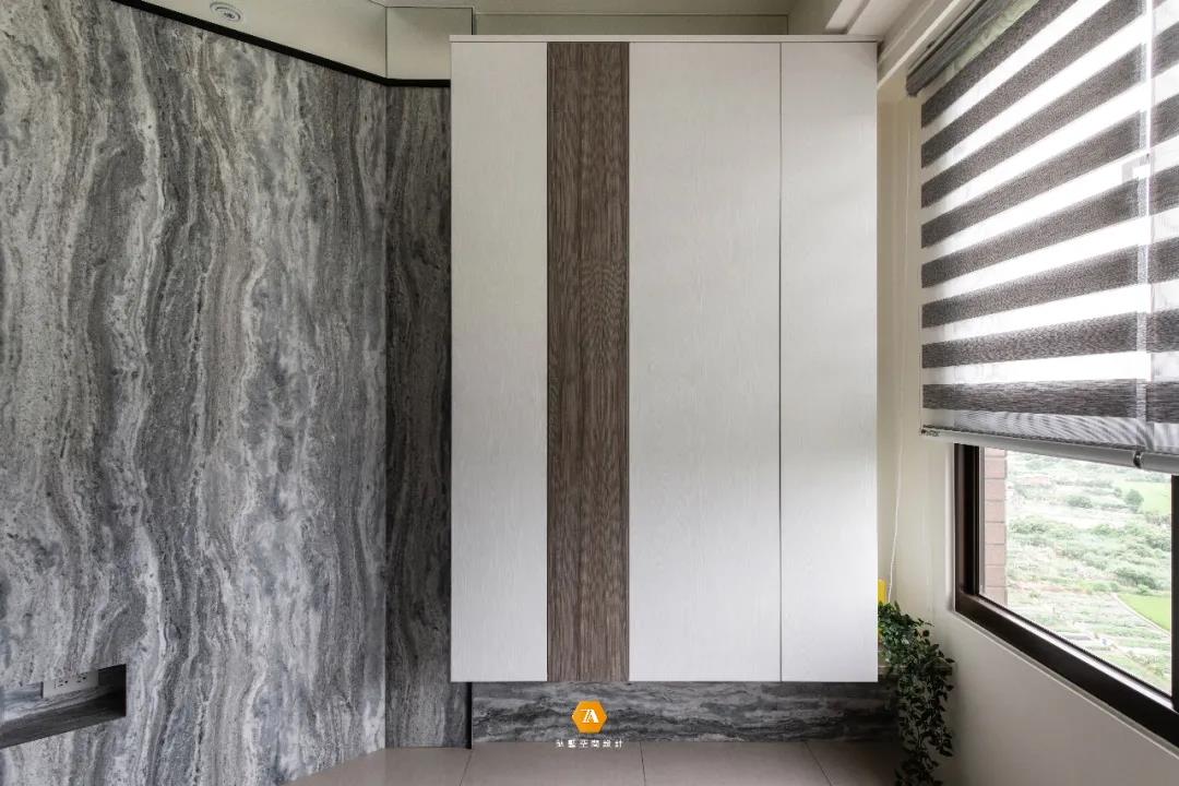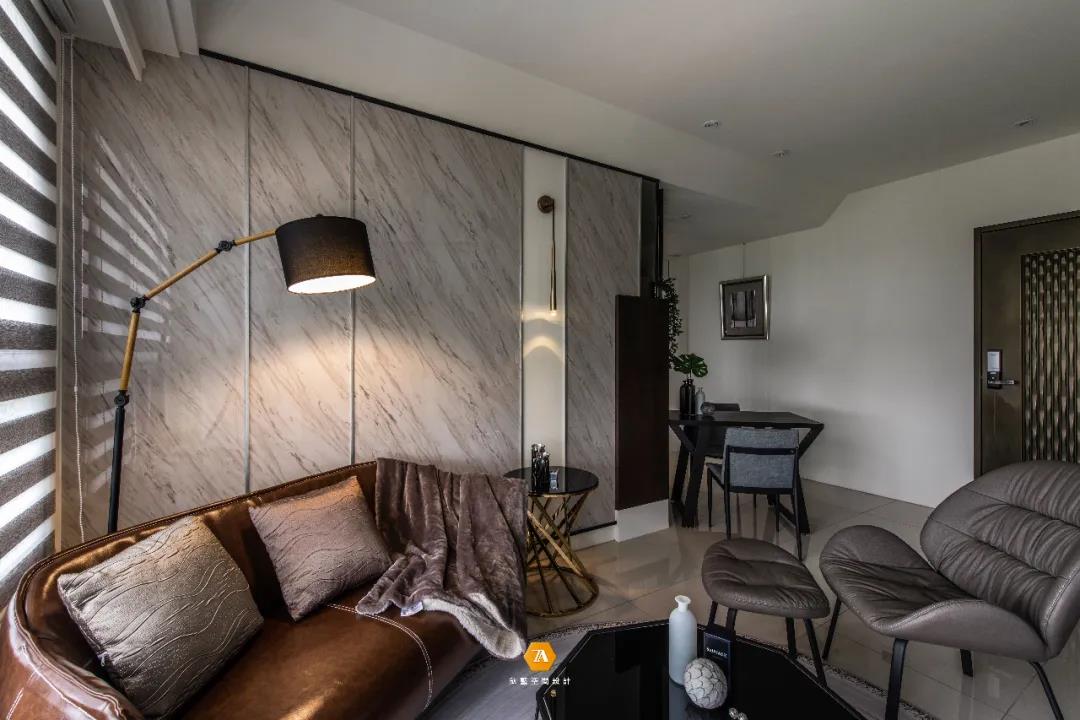 推開大門,進入玄關後第一眼看到的便是略帶輕奢的客廳;沙發背景墻大片的仿大理石磁磚與金屬條以不同分割比例鋪展開來,和石紋石塑板打造的電視主墻,一同形塑出氣派華貴的環境氛圍。而電視主墻的一旁,設計師則擺放了一個直升頂壁的大型吊櫃,滿足了客廳日常生活中的收納,也為空間增添了一絲現代時尚氣息。
