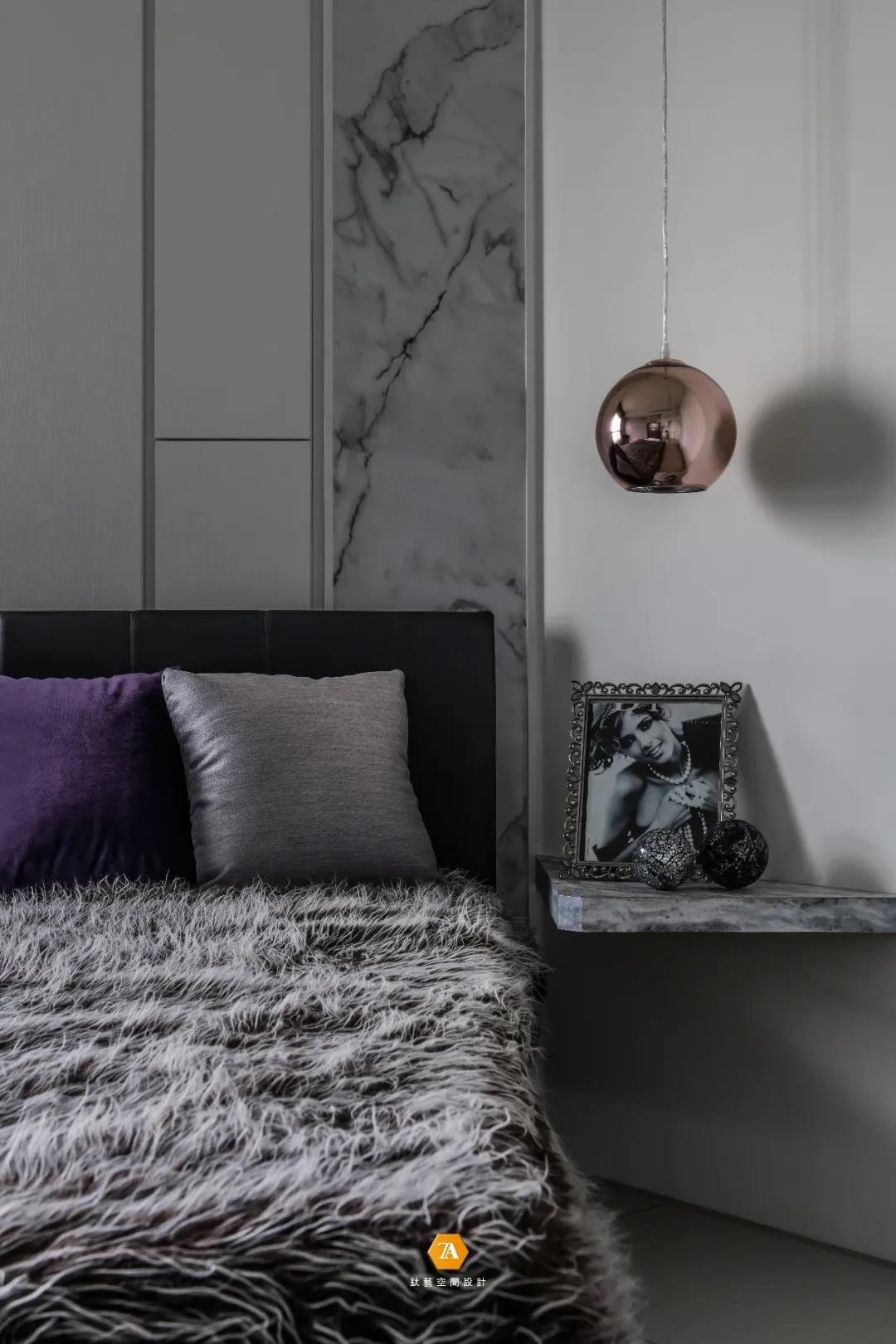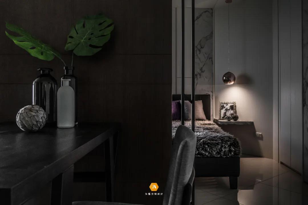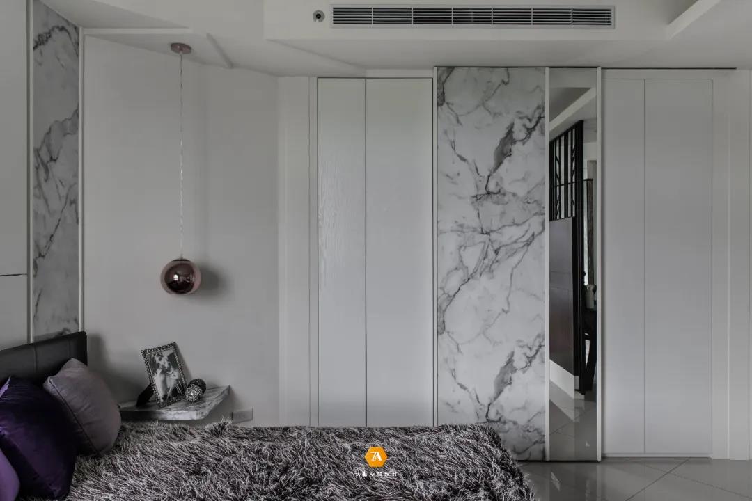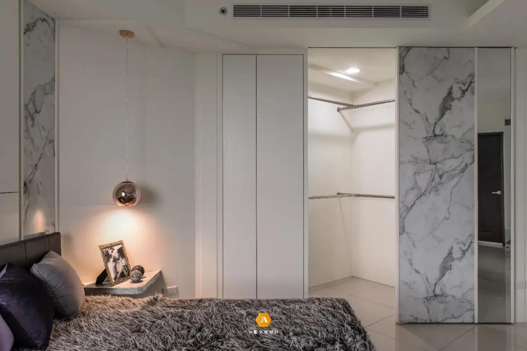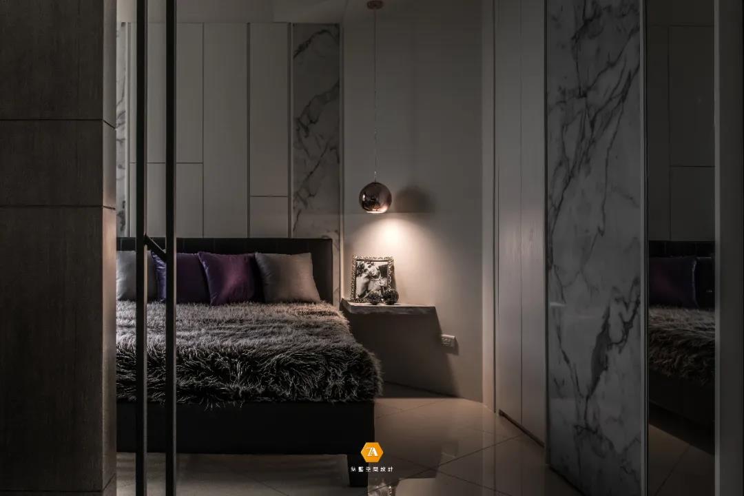 越過餐廳便進入了私領域——主臥,在空間上,設計師充分考量人文關懷,以創造一個時尚舒適的安眠環境為前提,減少了過度的造型設計,以簡約的設計手法,使視覺感官在空間上得到擴大,輕盈自在的空間感就此而生。