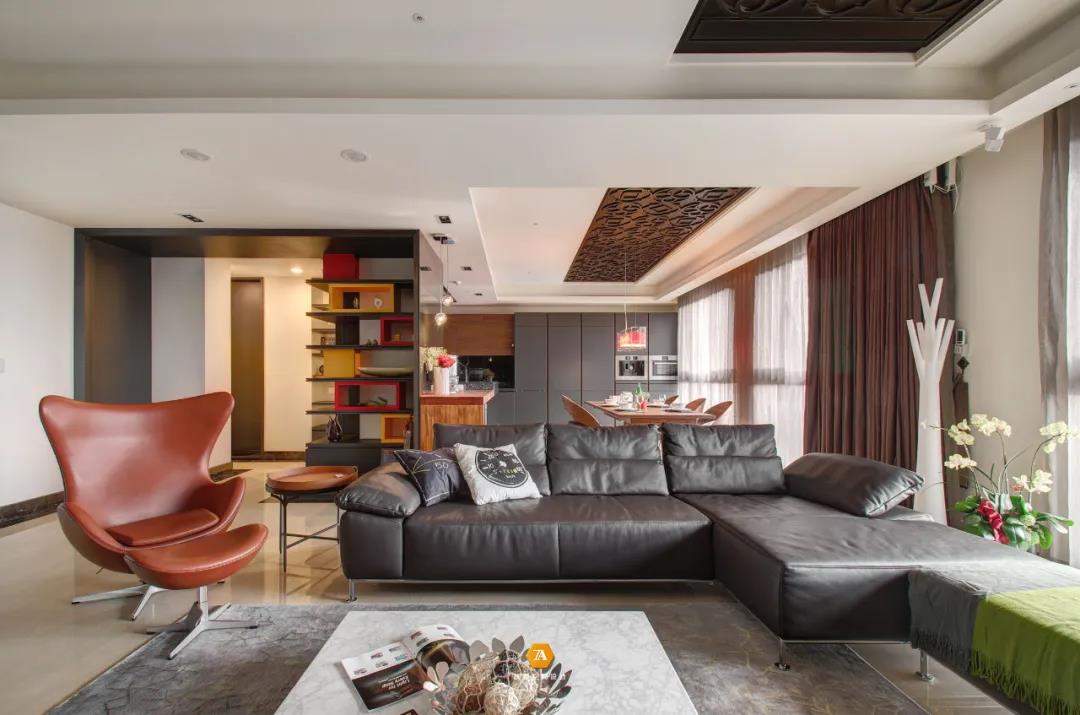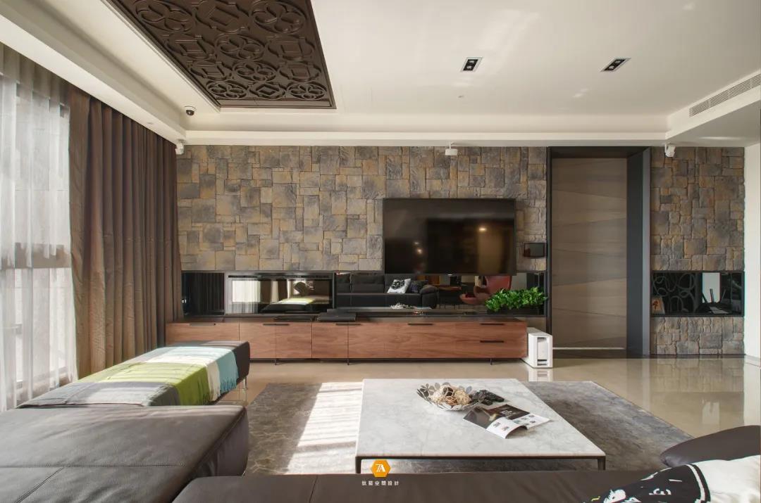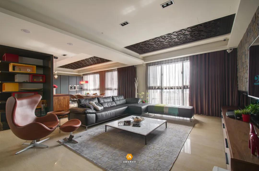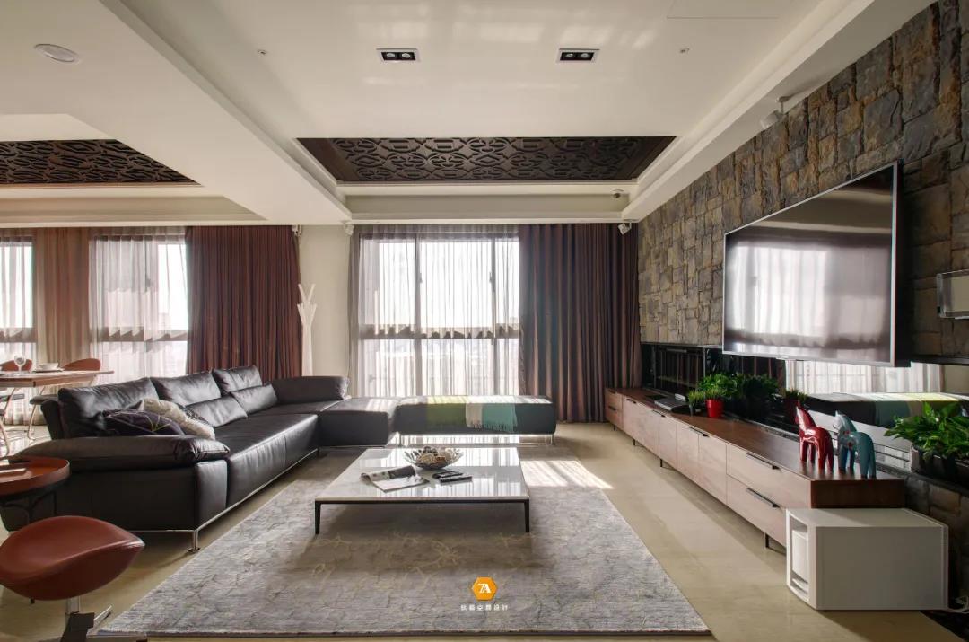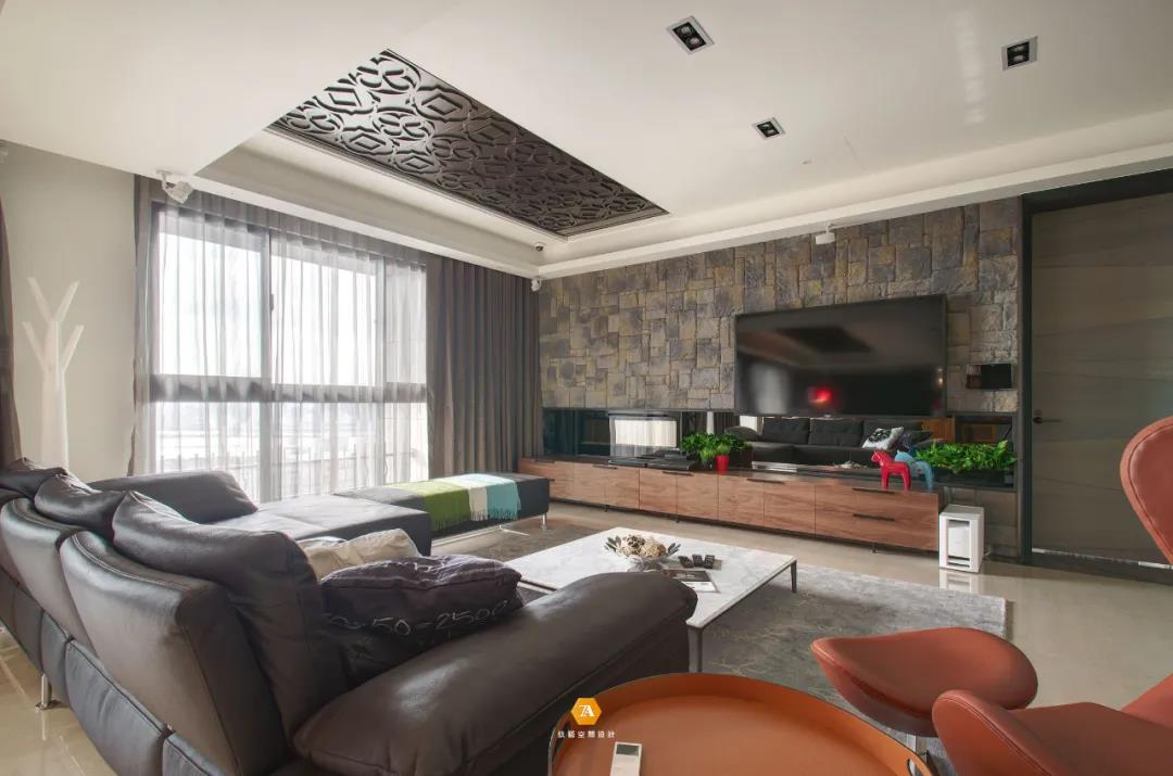 來到客廳區域,陽光透過大片落地窗照入室內,帶來自然清新氛圍,搭配深色系家具,又不至於使空間過於簡單,完美控製住了空間的平衡關系;而軟包電視背景墻與藝術造型的天花,則讓空間富有層次感,豐富了空間的感受。